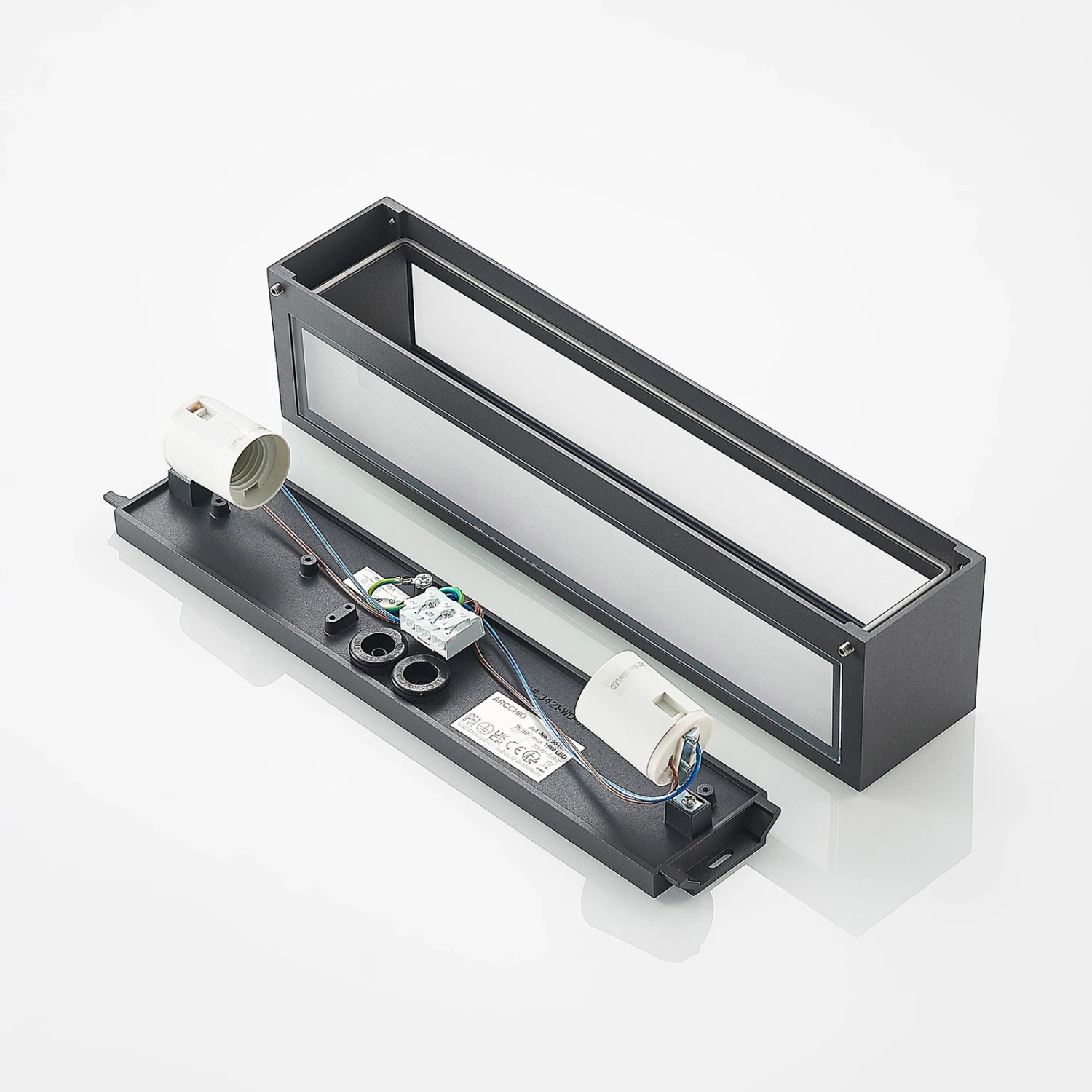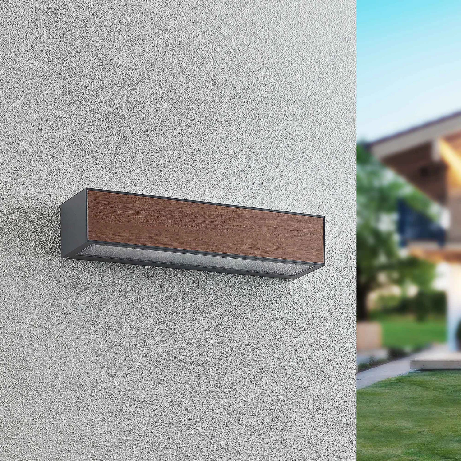 Längliche Außenwandleuchte Miraz in ansprechender Holzoptik, doppelter Lichtaustritt nach oben und unten
