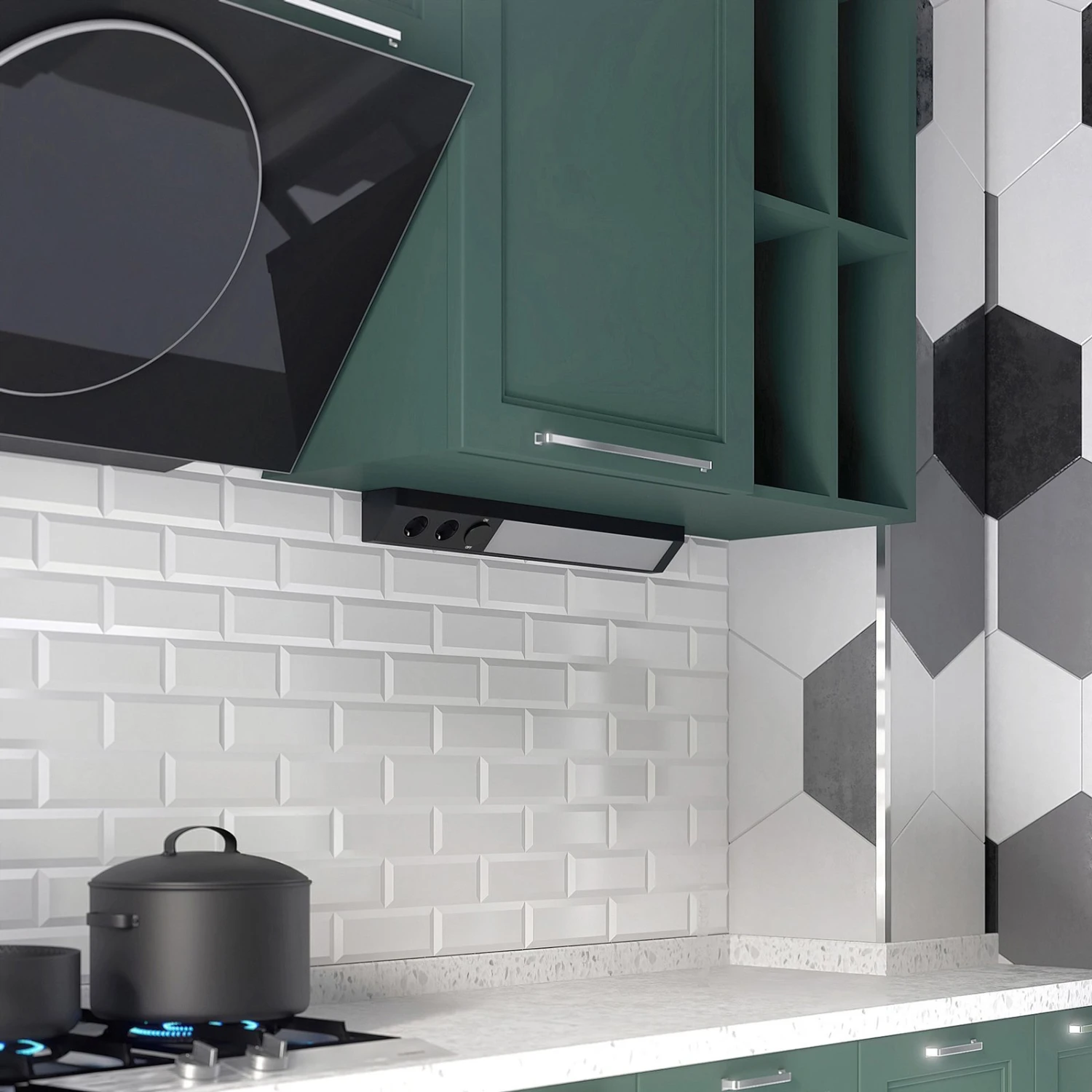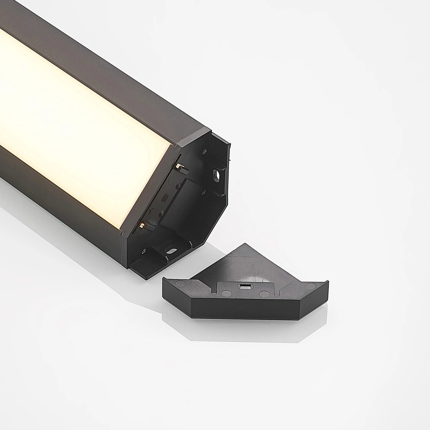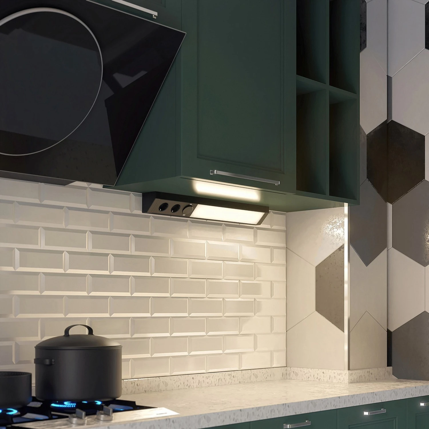 Dunkle LED-Unterbauleuchte Ovano mit zwei zusätzlichen Stromanschlüssen