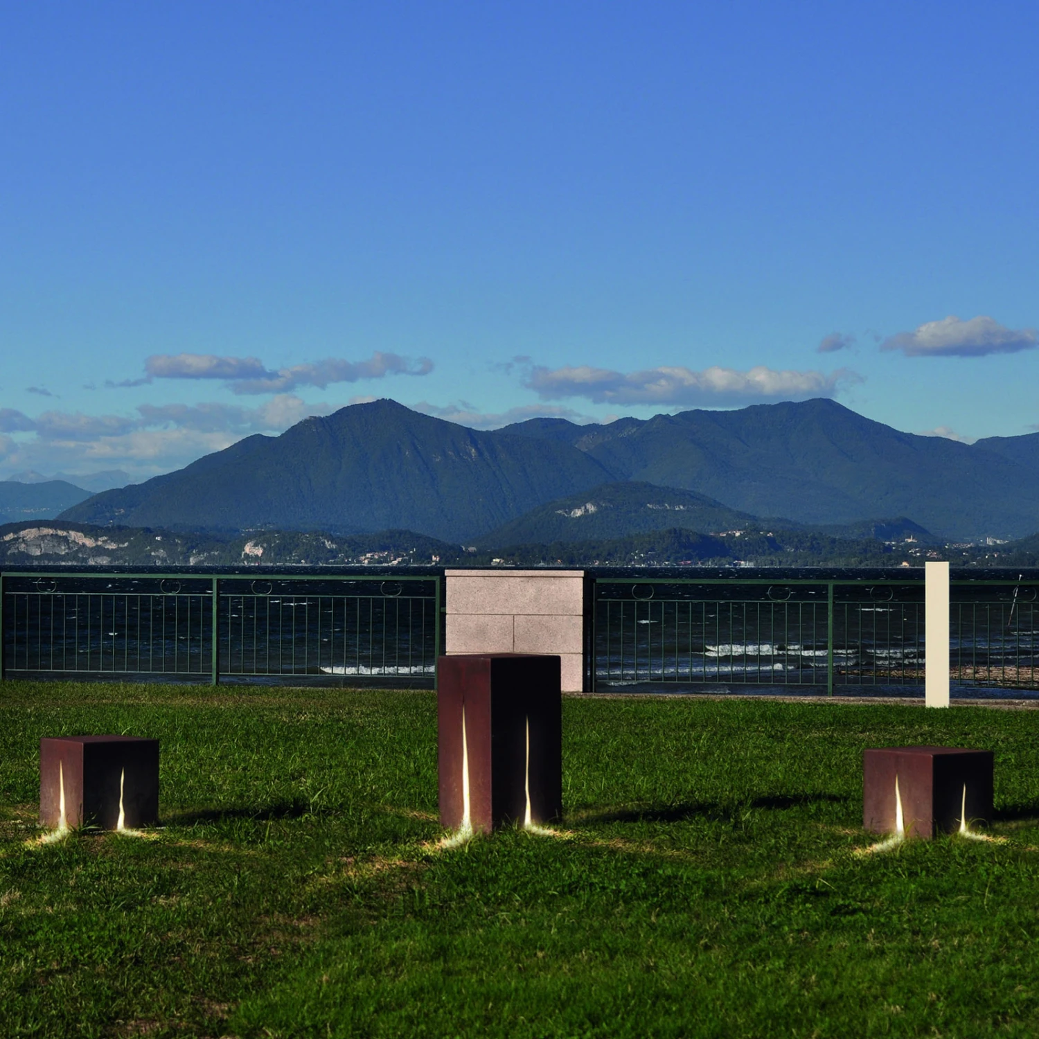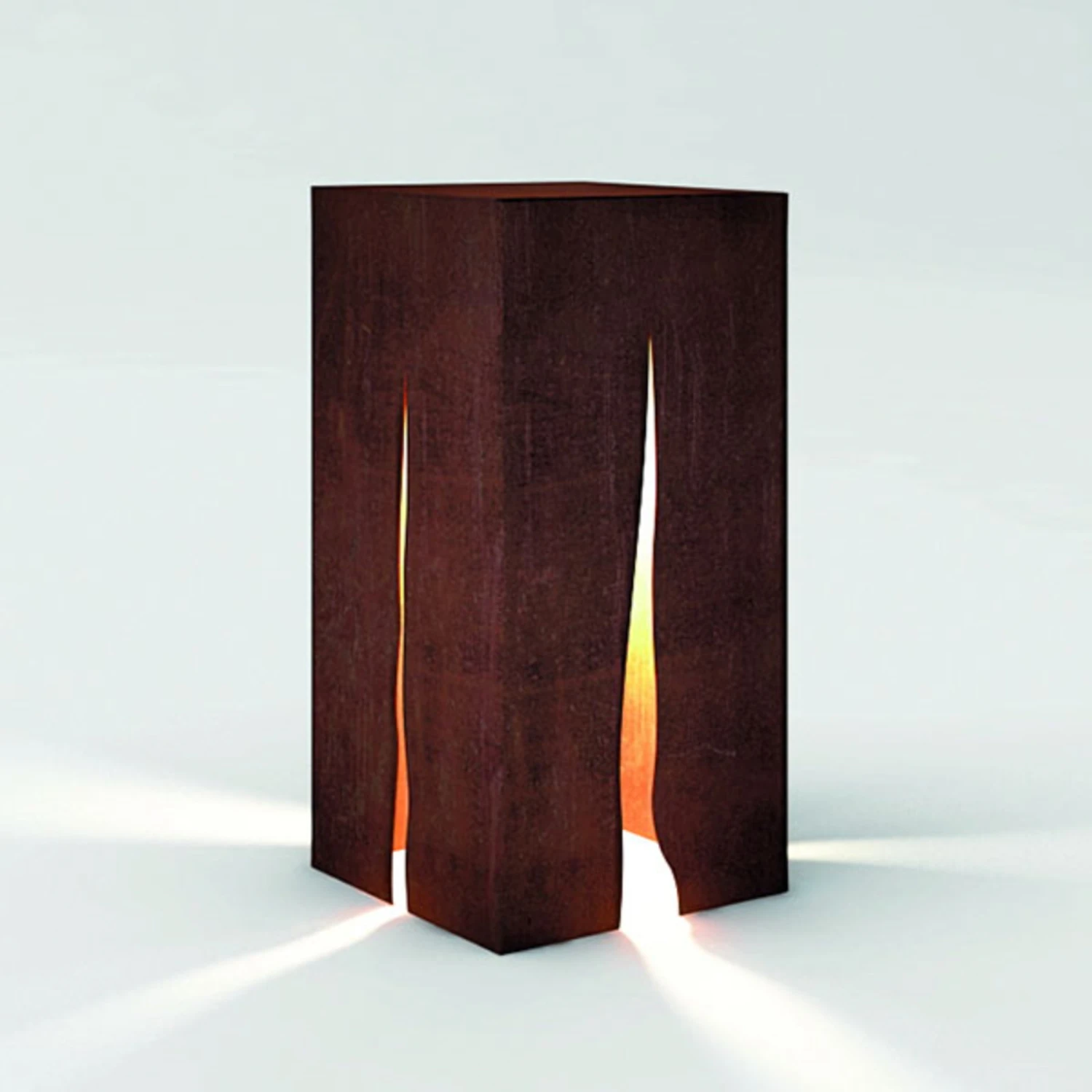 Mit der Wegeleuchte Granito lassen sich Grundstückswege, Gärten und Parkanlagen stimmungsvoll ausleuchten. Das Licht der einzusetzenden Lampe dringt aus den unregelmäßigen, vertikalen Lichtschlitzen, die in alle vier Seitenflächen eingearbeitet sind und erzeugt ein Muster aus vier Strahlen. Der Korpus ist aus Kortenstahl gefertigt; auch wenn sich die Oberflöche im Laufe der Zeit leicht verändern kann, ist die Leuchte absolut witterungsbeständig. Die Montage erfolgt mit der beiliegenden Stahlplatte auf einem Betonsockel oberhalb staunasser Flächen. Die Schrauben sind aus hochwertigem AISI 316 Edelstahl gefertigt.