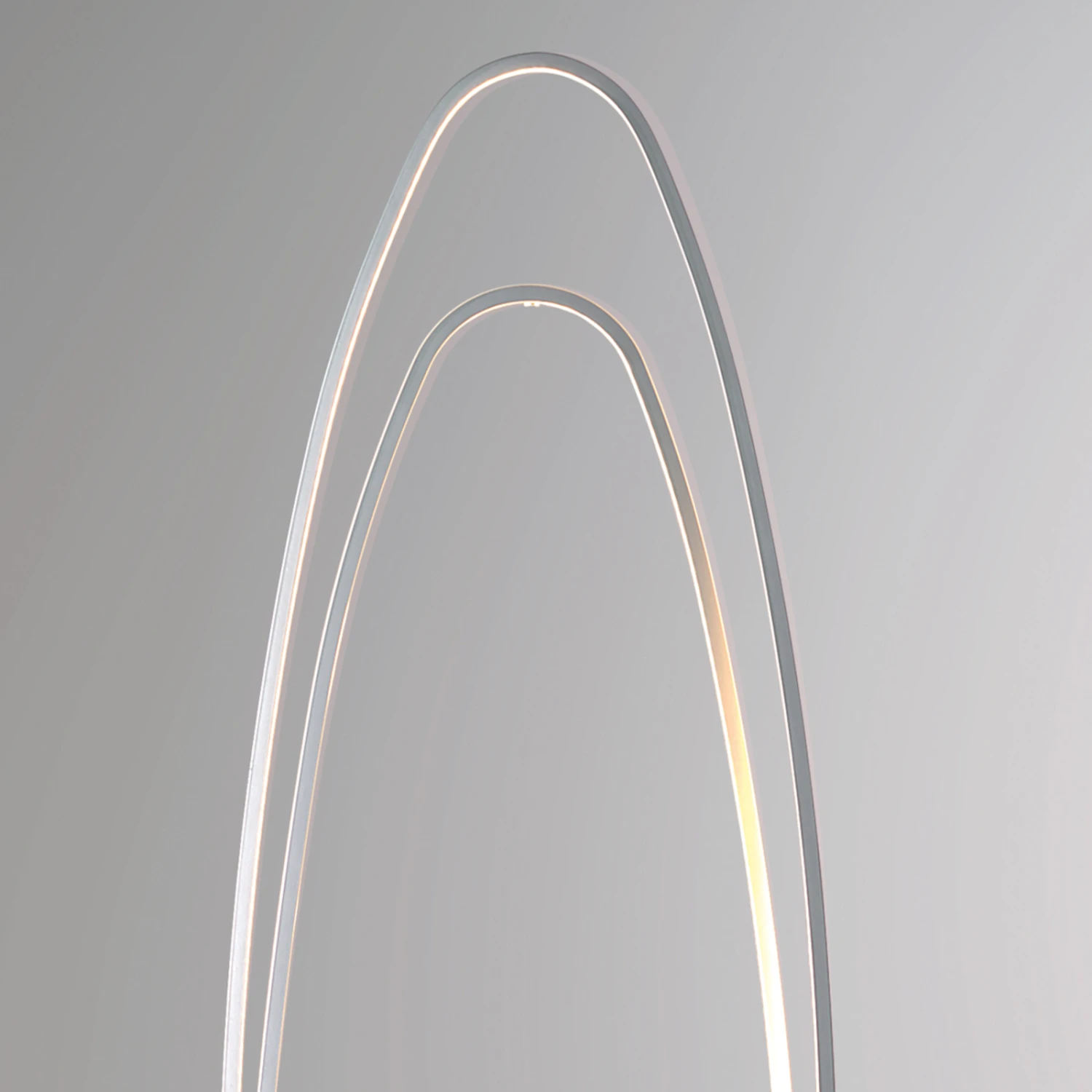 Die LED-Stehleuchte Flair heißt nicht nur Flair, sie verbreitet auch ein gewisses Flair, nämlich das von Leichtigkeit, Zartheit und Purismus. Ein schlankes Aluminiumprofil wurde so gebogen, dass zwei unterschiedlich große Ellipsen entstehen, die ineinander übergehen. Auf der Innenseite dieses Profils befindet sich das LED-Band, das für Licht sorgt. Damit man den relativ hohen Lichtstrom dieser LEDs an die jeweiligen Bedürfnisse im Raum anpassen kann, verfügt die Stehleuchte Flair über einen integrierten Touchdimmer, der sich in der Spitze der Leuchte befindet. Dort kann man nicht nur die Helligkeit regeln, man kann die Leuchte auch ein- und ausschalten. Design und Qualität gehen bei der in Deutschland hergestellten Stehleuchte Flair eine perfekte Symbiose ein. Mit dieser BOPP-Leuchte erwirbt man nicht nur ein Qualitätsprodukt, sondern auch ein kleines Lichtkunstwerk, das als Einrichtungsgegenstand für eine besondere Atmosphäre im Raum sorgen kann.