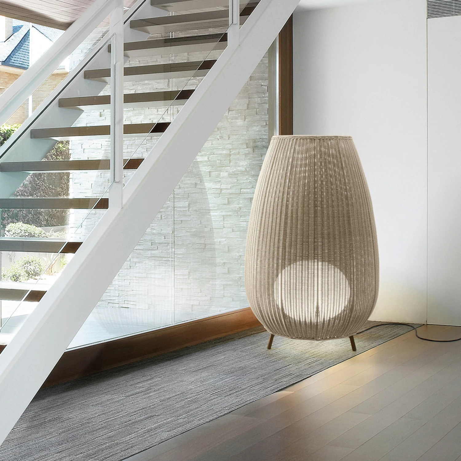 Ein stilvoll gestalteter Außenbereich eines idyllischen Restaurants oder Cafés – genau hier ist der ideale Platz für die in Spanien hergestellte Stehleuchte Amphora 03. Doch auch großzügige private Außenanlagen und natürlich auch Innenräume bereichert die in wertiger Rattanoptik gestaltete Leuchte gleichermaßen. Entwickelt, um ihre Umgebung mit einem warmen Licht zu erfüllen, schafft Amphora 03 ein mediterranes Ambiente zum Wohlfühlen. Der bauchige Leuchtenkorpus wurde am Firmensitz von Bover in Barcelona aus einem synthetischen Korbgeflecht handgeflochten. Inmitten des Korbgeflechts ruht eine Ellipse aus Polyethylen, in deren Inneren die beiden Lichtquellen sitzen – dank der Schutzart IP65 perfekt geschützt vor jeglichen Witterungseinflüssen. Ausgehend von der Ellipse, breitet sich ein facettenreicher Lichtschein durch das Flechtwerk hindurch in die Umgebung der Leuchte aus.