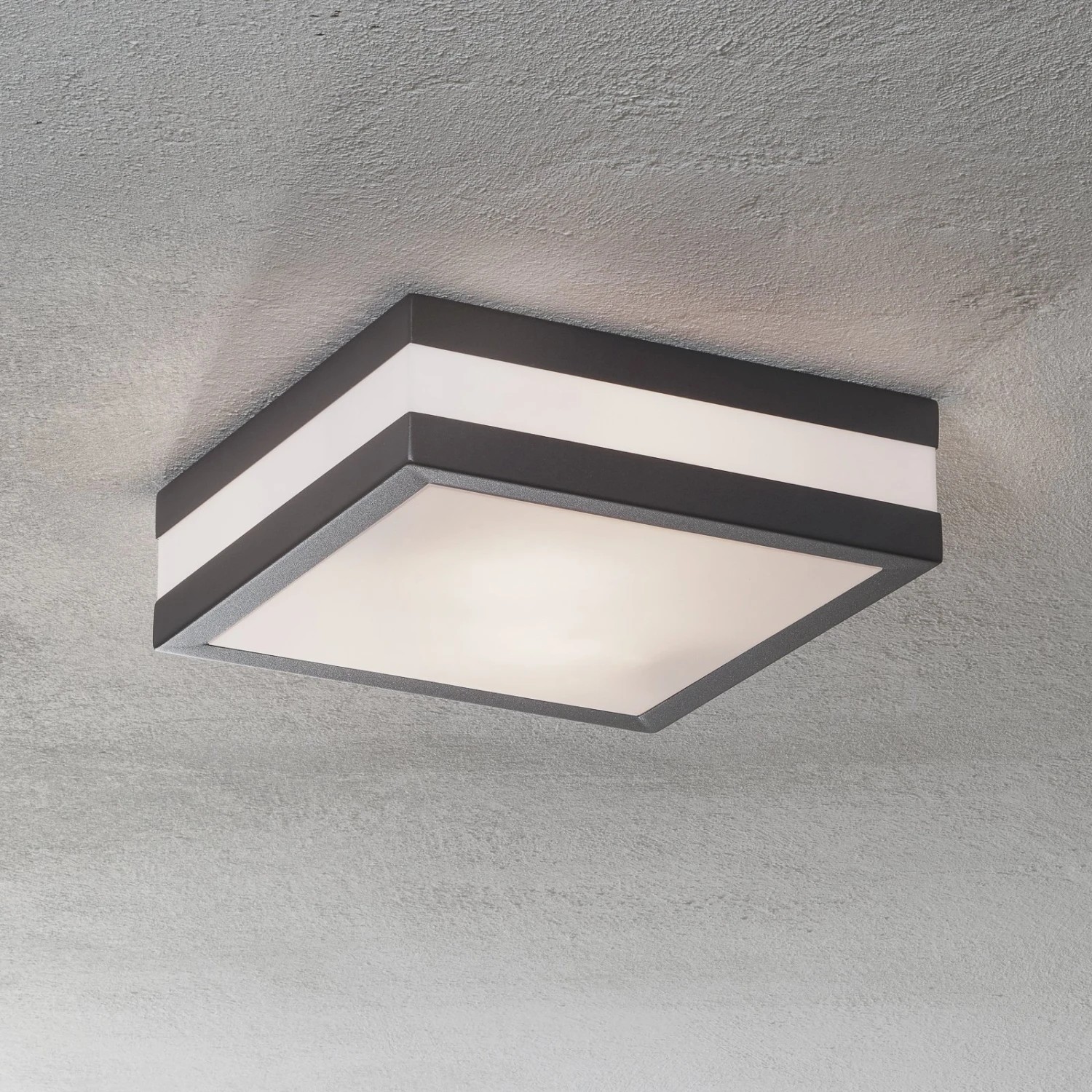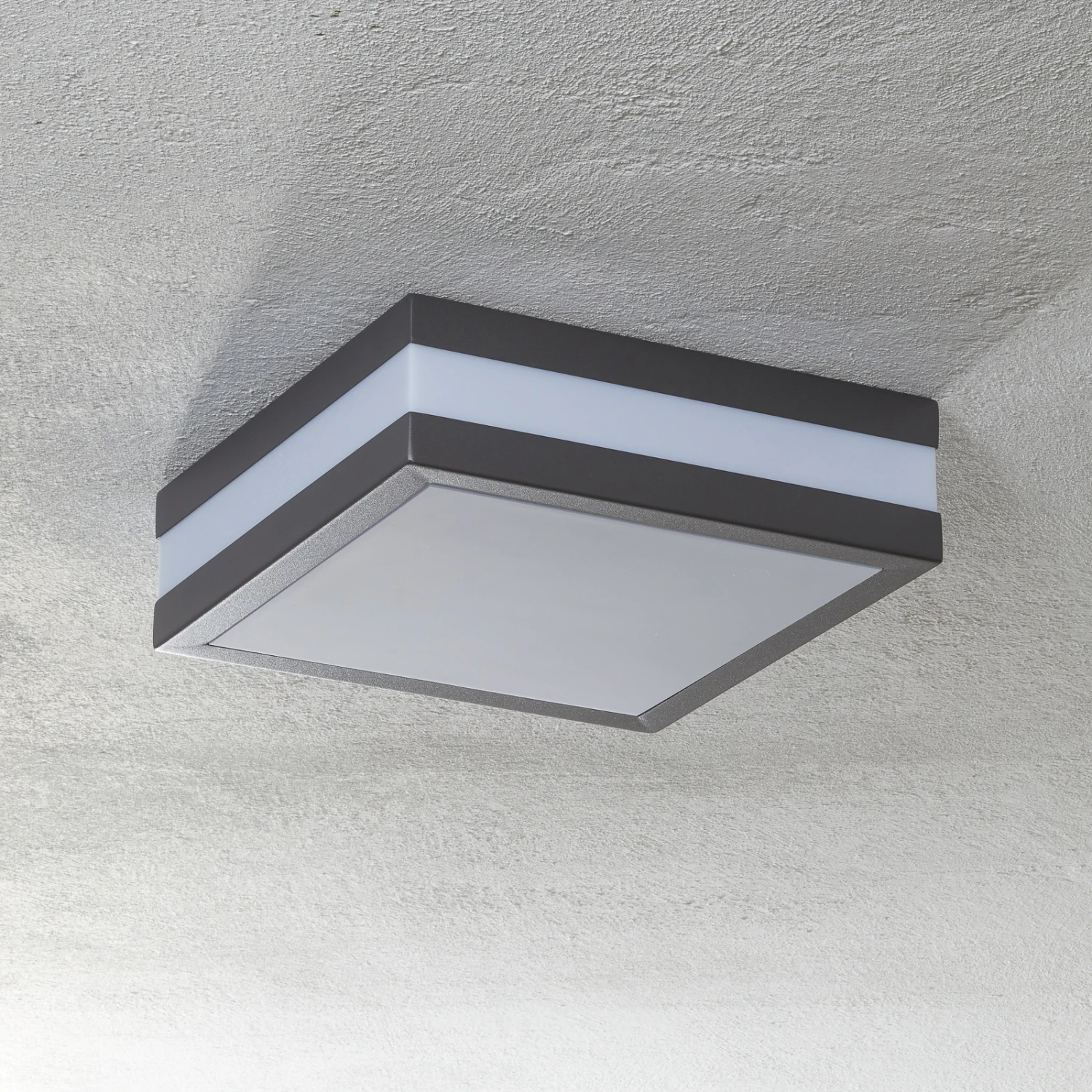 Die Außenleuchte Matteo ist für die Montage an der Decke vorgesehen. Sie ist mit IP44 gegen Spritzwasser geschützt, wodurch sie im Außenbereich problemlos eingesetzt werden kann. Ihr Rahmen umfasst den weißen Kunststoffdiffusor und ist aus anthrazitfarbenem Edelstahl hergestellt – so sieht die Deckenlampe hochwertig und elegant aus und sorgt zusätzlich für ein blendfreies Licht. Durch den Rahmen entsteht ein dezentes Lichtmuster, das sich in der Umgebung abzeichnet und ein ansprechendes Ambiente erzeugt. Mit Matteo können Carports, Garagen, Vordächer, Fassaden oder auch Terrassen und Balkone ideal beleuchtet werden.