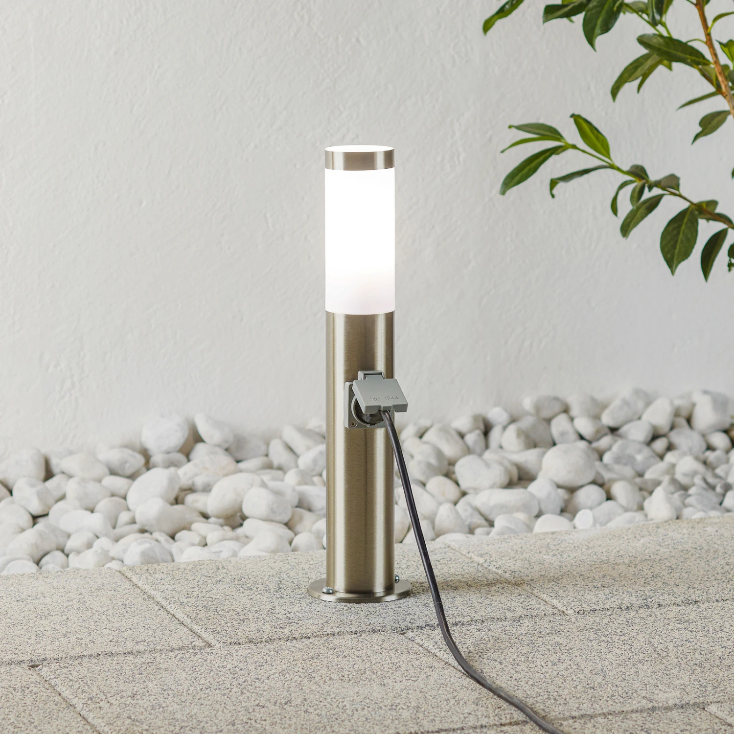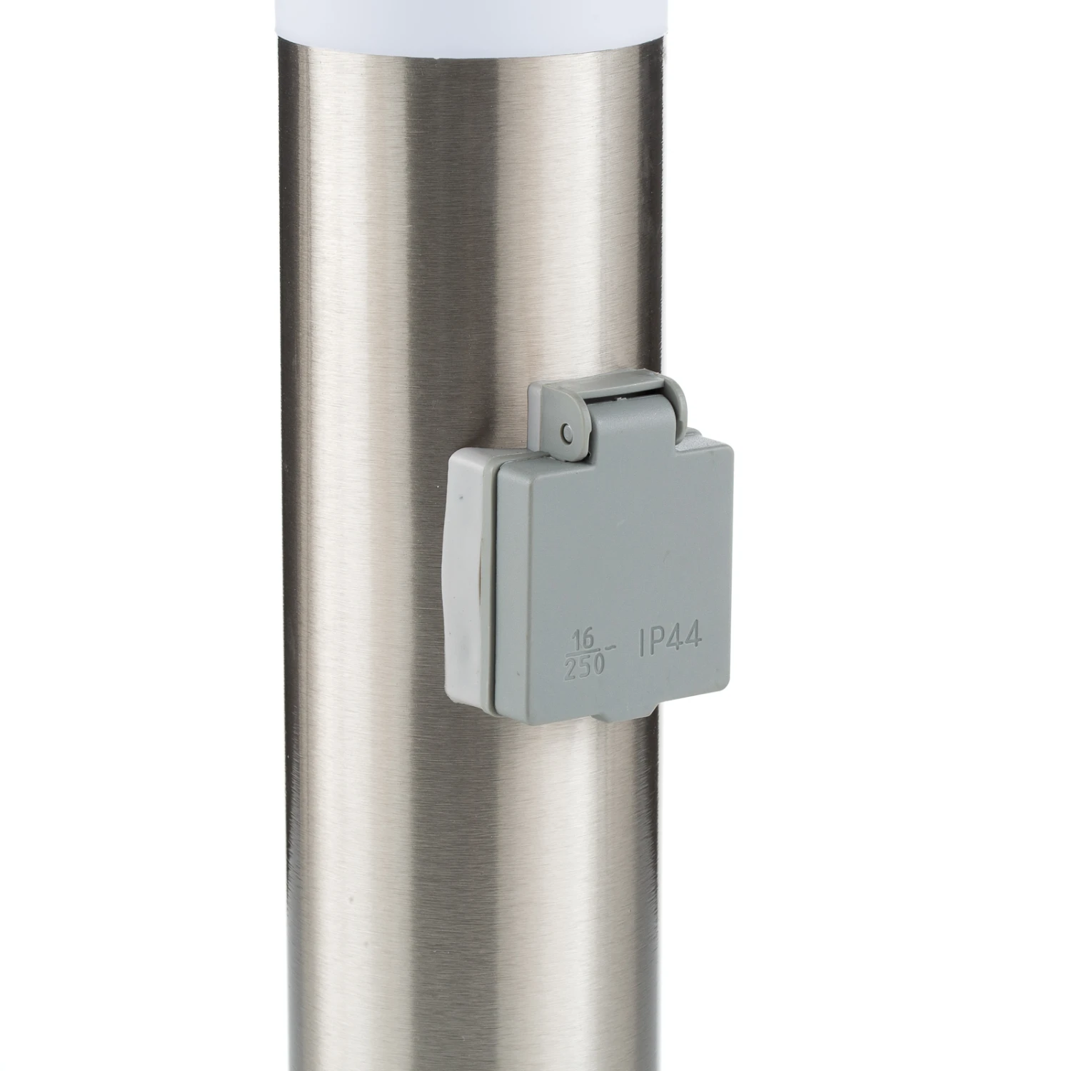 Zylindrische Sockelleuchte Chorus aus Edelstahl mit Steckdose