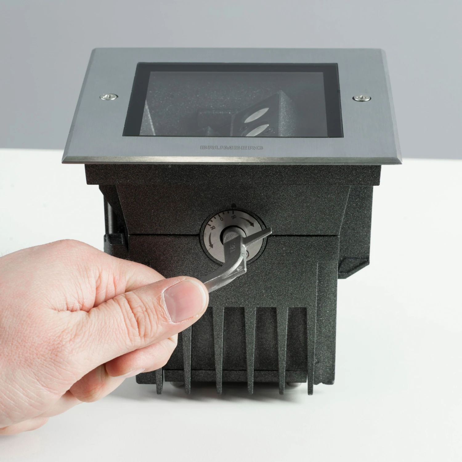 Die quadratische Boden-Einbauleuchte Hybride besteht aus einem Gehäuse aus rostfreiem V4A-Edelstahl (CrNiMo) und einer klaren Glasabdeckung. Sie ist wasserdicht, schlagfest und belastbar – ideal für den Einsatz auch in Zufahrten. Die im Inneren gelegenen LED-Module lassen sich vor der Montage schwenken, sodass beispielsweise die angrenzende Fassade betont werden kann.