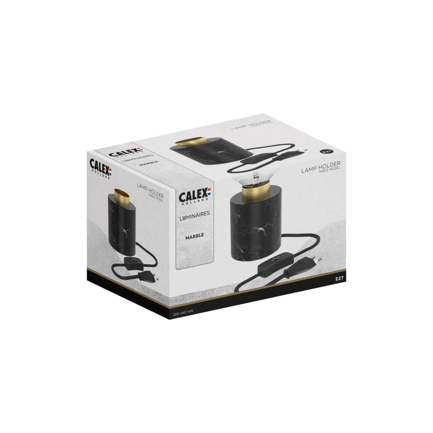 Die aus Marmor gefertigte Tischleuchte von Calex in Zylinderform überzeugt mit ihrer eleganten Erscheinung. Ein gold lackierter Streifen aus Metall ist als zusätzliche Applikation um die Fassung arrangiert. Durch die offene Gestaltung der Fassung lassen sich verschiedenste Leuchtmittel, beispielweise große Globelampen oder Lampen mit Sonderform, einsetzen. Besonders Leuchtmittel mit sichtbaren Filamenten bieten sich an und passende Optionen sind über das Zubehör separat erhältlich. Im Stromkabel ist ein Schalter (ein/aus) verbaut.