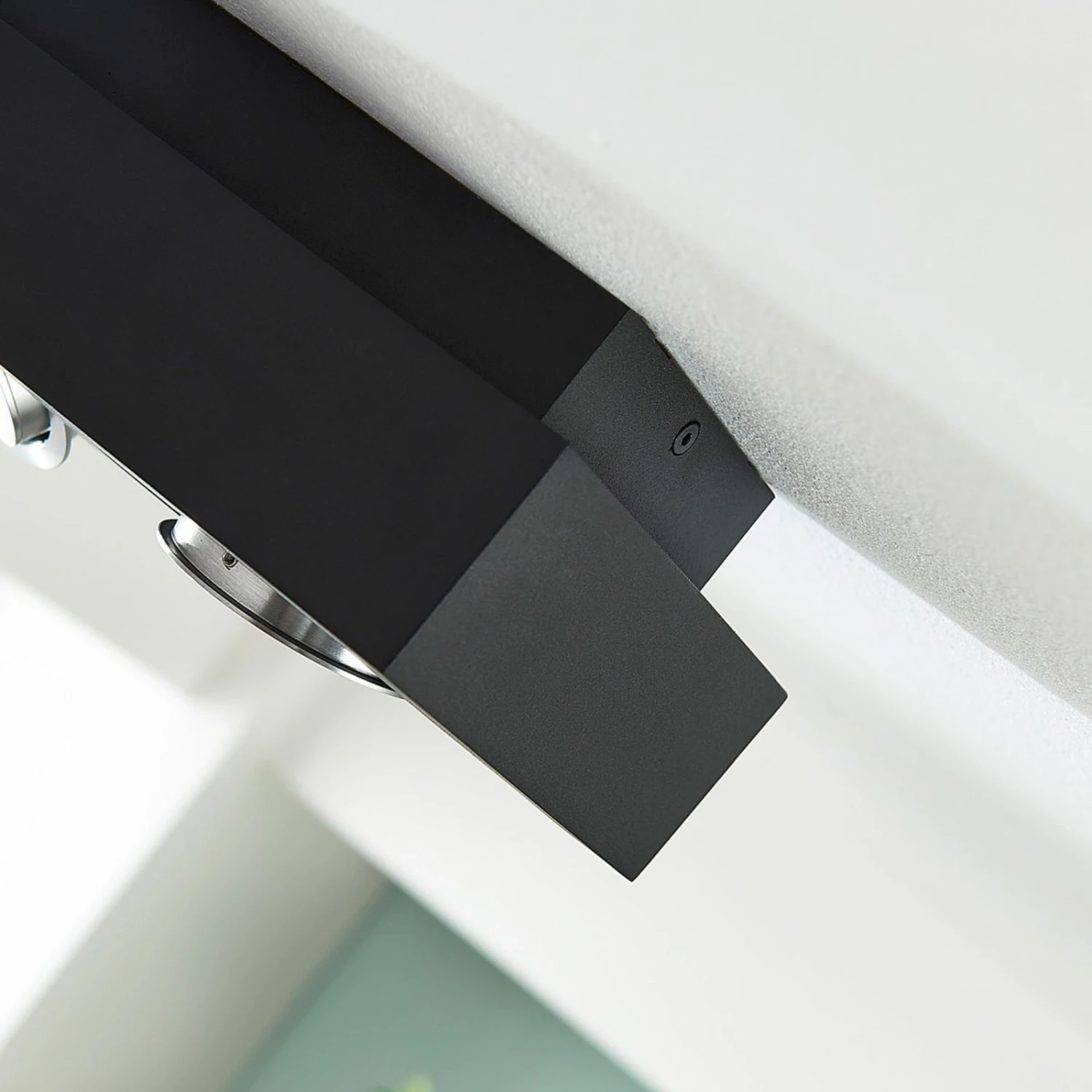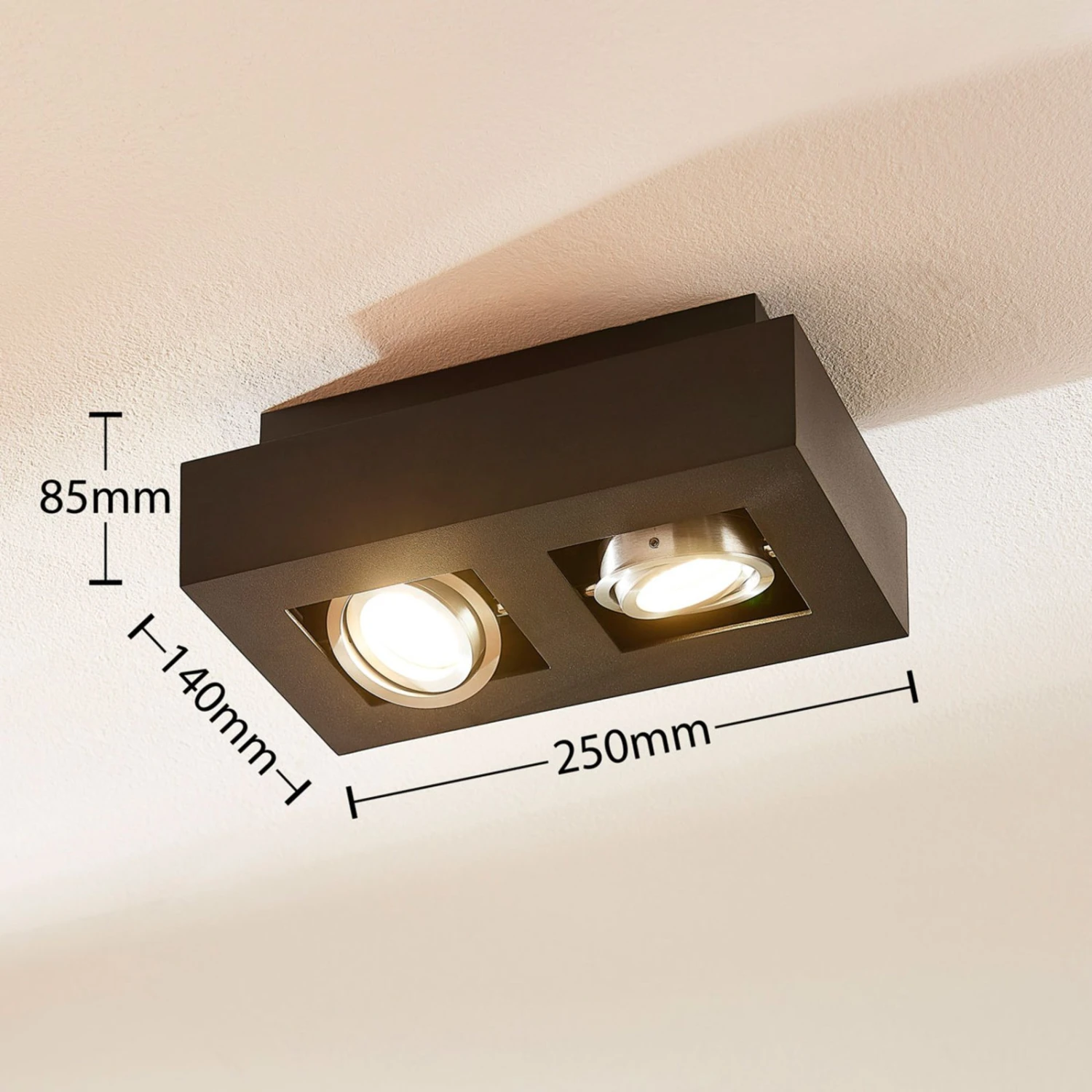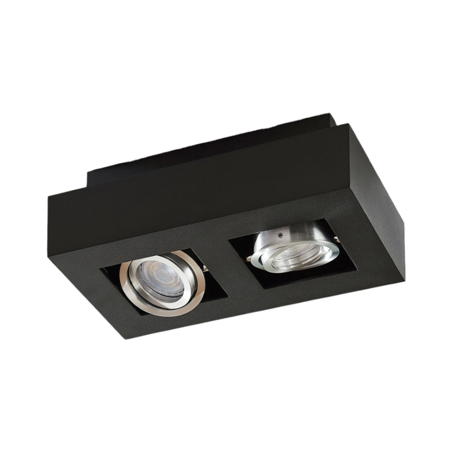 Diese zweiflammige Deckenlampe hat ein Metallgehäuse mit mattschwarzem Finish und zwei Leuchtmitteleinsätze für GU10-LED-Lampen. Beide Einsätze lassen sich bei Bedarf schwenken, weshalb man die Lichtausrichtung gut anpassen kann. Die schwarze Oberfläche lässt sich mit vielen Umgebungen kombinieren, das Design der Deckenleuchte hat dabei eine technische Note, die privat oder gewerblich gefällt.