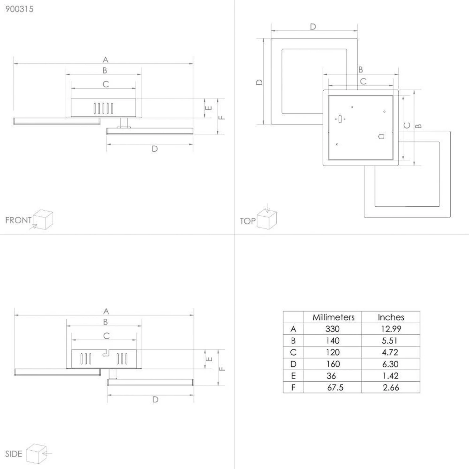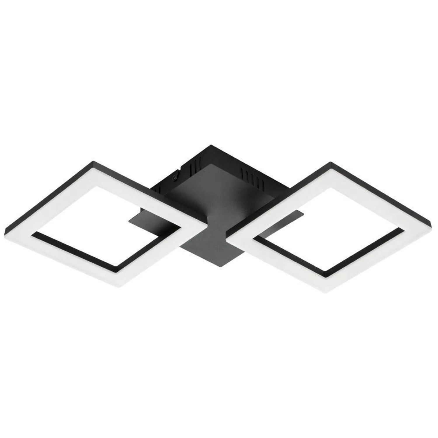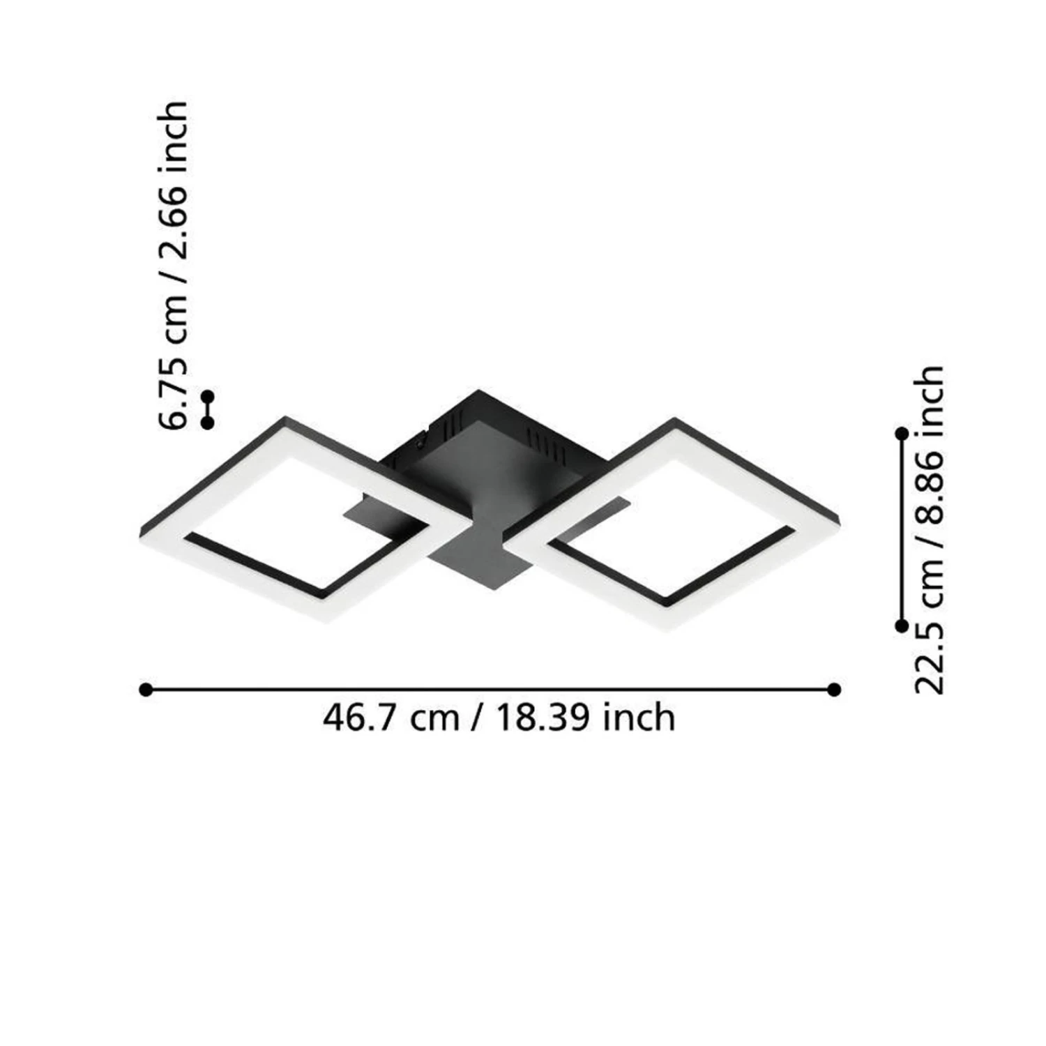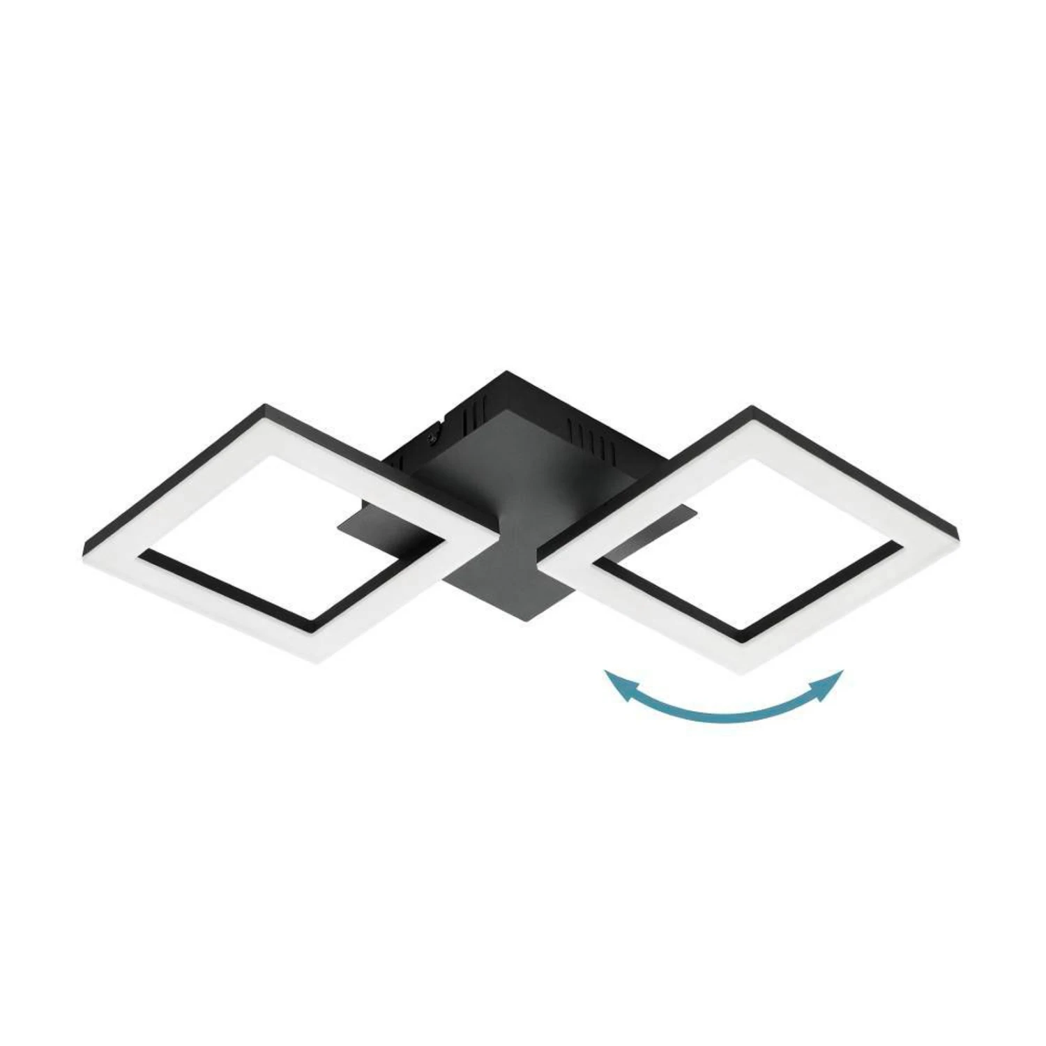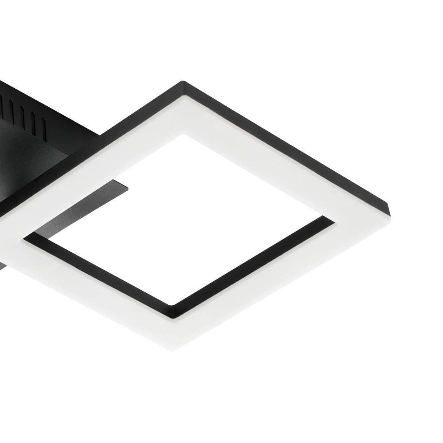 Das aus Stahl gefertigte, schwarze Gestell setzt sich aus zwei Quadraten zusammen, die die Lichtquellen bilden. Ihre LEDs sitzen auf dem Rahmen unter Kunststoffabdeckungen und erzeugen ein gleichmäßiges Licht. Die beiden Leuchtelemente lassen sich verstellen, wodurch die Lichtstrahlung beeinflusst werden kann.