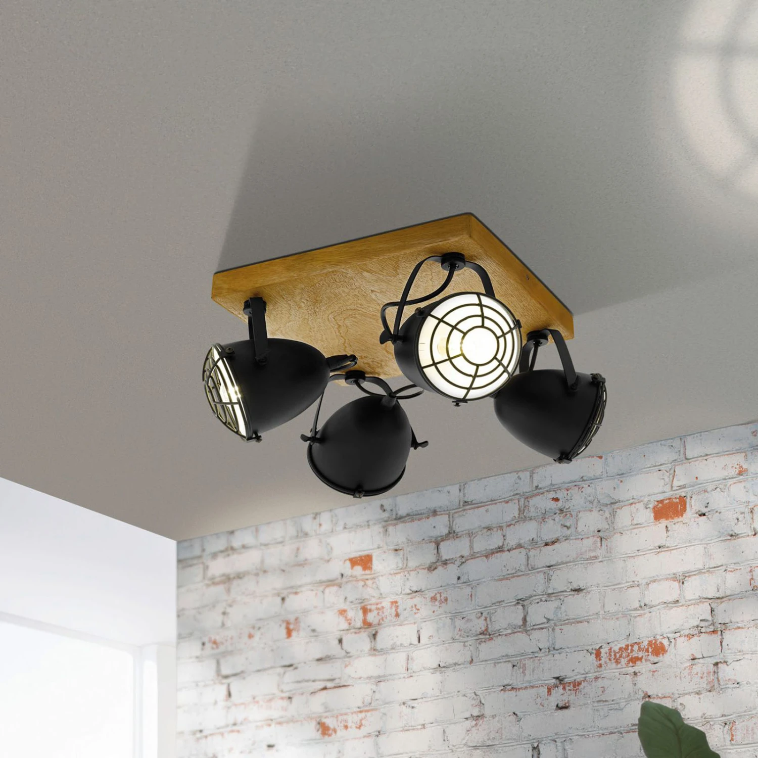 Vom Wohnraum über den Flur bis zum Schlafzimmer oder Jugendzimmer lässt sich der vierflammige Deckenstrahler Gatebeck als variabel in verschiedene Richtungen einstellbare Deckenleuchte anbringen. Der Strahler mit seinen vier Stahlschirmen mit Schutzgittern und einer quadratischen Deckenplatte aus hellem, naturbelassenem Holz passt sowohl in den modernen Landhauslook mit Naturholzmöbeln als auch in eine industriell geprägte Einrichtung. Neben Glühlampen lässt sich der Strahler auch mit LED-Lampen bestücken, um Energiekosten einzusparen. Passende Leuchtmittel sind hinterlegt und können direkt mitbestellt werden.