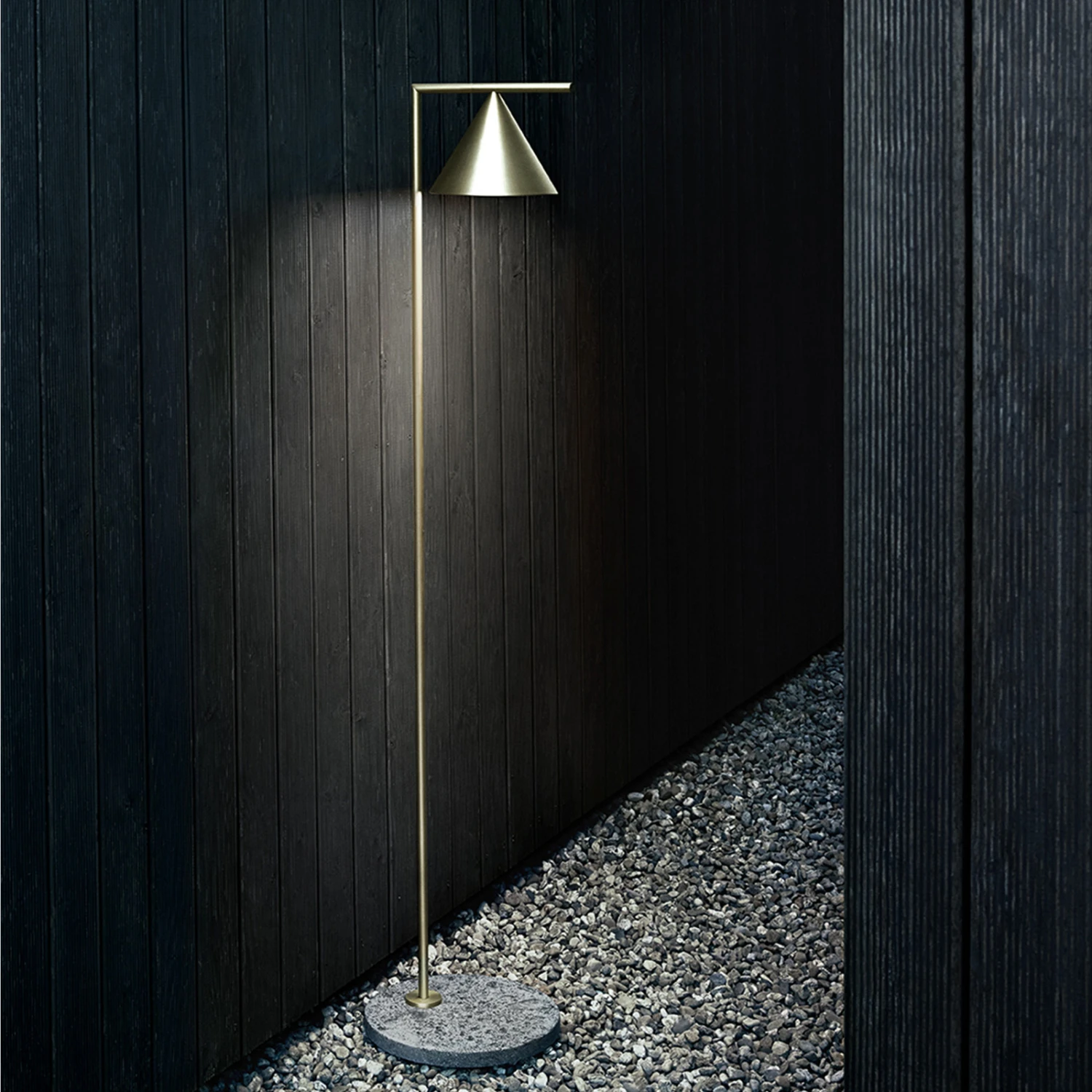Ihr graziles Gestell aus Messing wird von einem soliden und stabilen Fuß aus Marmor getragen, der in einem natürlichen Grauton den Charakter des Marmorsteins widerspiegelt. Dank der langen Zuleitung lässt sich die Leuchte flexibel platzieren und macht auf der Terrasse eine ebenso gute Figur wie im Eingangsbereich oder an einem Weg im Garten. Der kegelförmige Schirm ist rundherum lichtundurchlässig gearbeitet und strahlt das Licht direkt nach unten ab. Er ist an einer horizontalen Stange montiert und lässt sich bis zu 315° bewegen, wodurch der Lichtstrahl beliebig gelenkt werden kann. Um ein stimmungsvolles Ambiente zu erschaffen, kann die Stehlampe über den integrierten Schalter nicht nur an- und ausgeschaltet, sondern auch gedimmt werden.