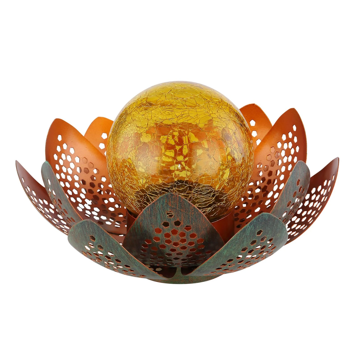 Die LED-Solarleuchte eignet sich dank ihrer Blütenform besonders schön für die Platzierung an Gartenteichen oder Pools, aber auch für jeden anderen Ort im Außenbereich. Die bernsteinfarbene Glaskugel im Inneren der Leuchte strahlt am Abend und wird von Blütenblättern umrahmt, die innen amberfarben sind und außen grün. Dank der amberfarbenen Innenseite erhält das Licht eine zusätzliche warme Wirkung. Durch die Crackle-Optik der Kugel und die gestanzten Blätter entsteht bei Dunkelheit ein faszinierendes Lichtmuster. Die LED-Leuchte wird mit Solarenergie betrieben, sodass keine externe Stromquelle benötigt wird. Mit dem integrierten Schalter kann sie bequem an- und ausgeschaltet werden. Die Leuchtdauer beträgt bis zu 8 Stunden.