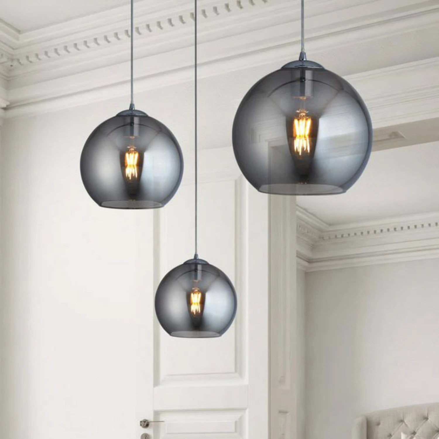 Gläserne Pendelleuchte Balls mit rauchfarbenem Kugelschirm