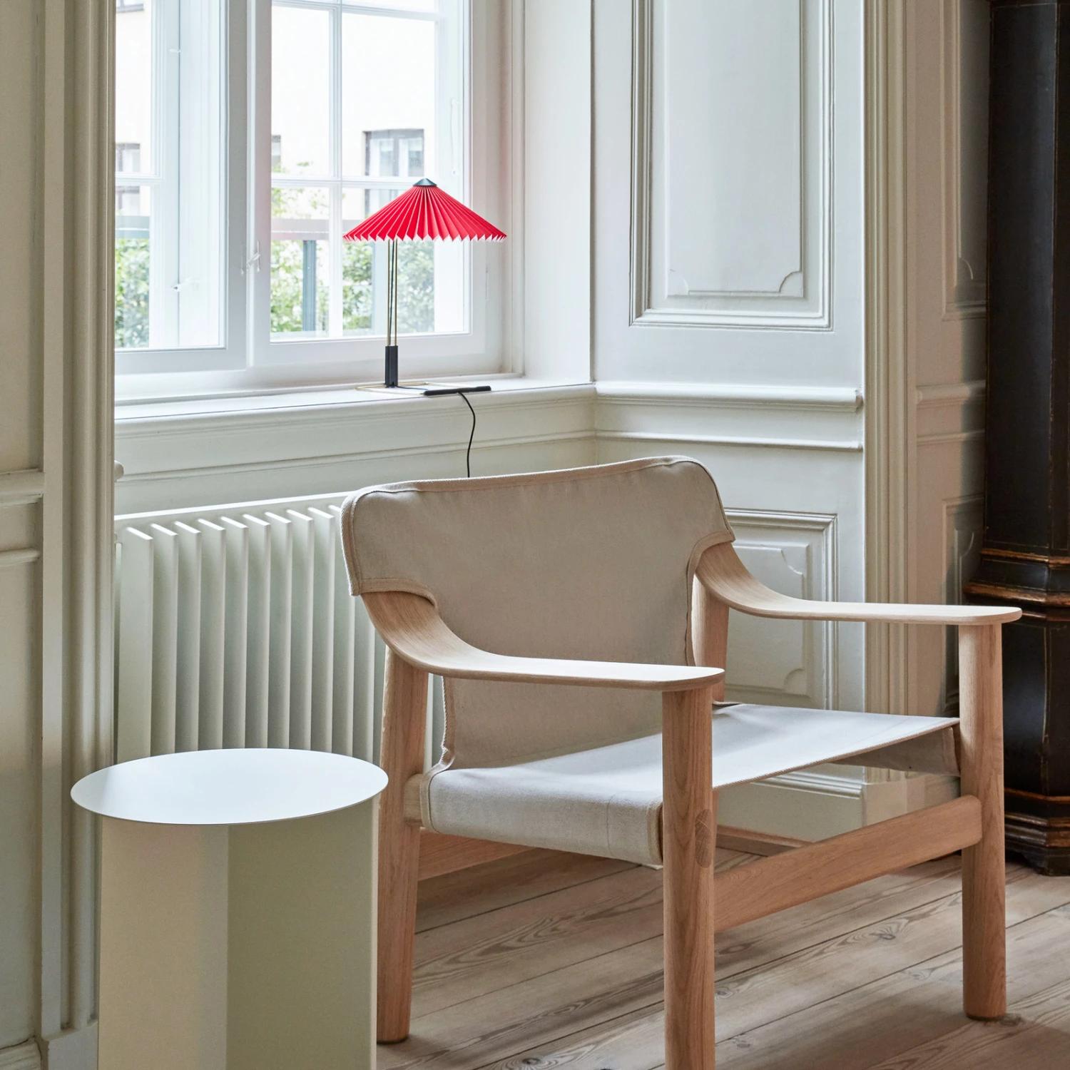 Die LED-Tischleuchte Matin ist ein Entwurf der französischen Designerin Inga Sempé, die in der Leuchte ein zeitgemäßes und dennoch poetisches Design und visuelle Feinheit mit physischer Robustheit verbindet. Inga Sempé lebt und arbeitet in Paris und wurde bereits im Jahr 2007 mit dem Red Dot Design Award ausgezeichnet. Ihre Arbeiten sind bekannt für eine besondere Leichtigkeit, eine starke Persönlichkeit und eine besonders taktile Art, wie auch die Tischleuchte Matin 300 eindrucksvoll unter Beweis stellt. Das Gestell der Tischleuchte besteht aus einem gebogenen Stahldrahtrahmen in poliertem Messing mit schwarzen Details aus ABS-Spritzguss. Auf diesem sitzt ein Schirm in weiter Form aus plissierter Baumwolle in schönen Farben, die auf eine PVC-Folie laminiert wurde.