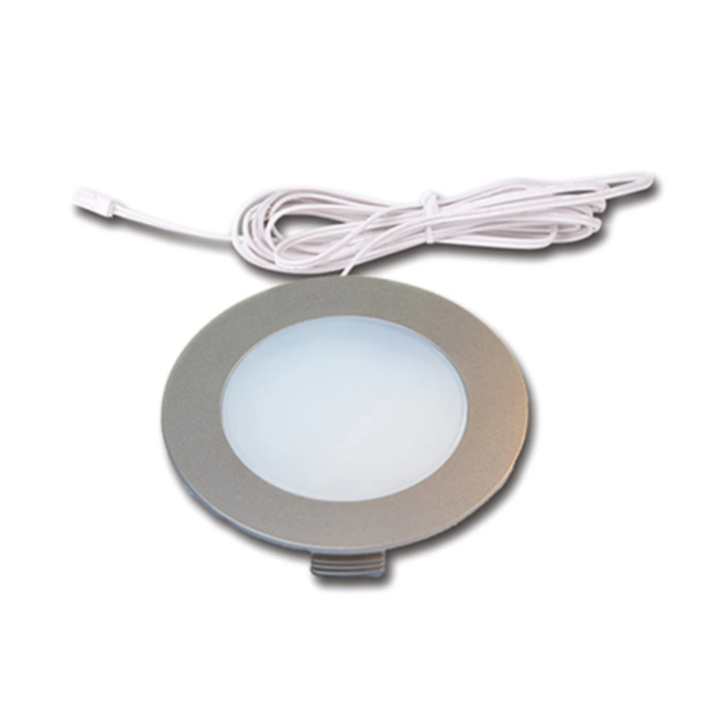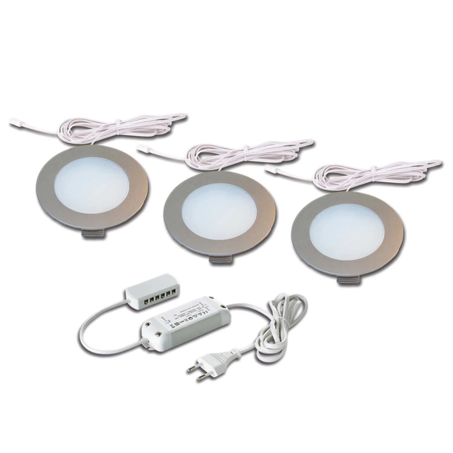 Die Grundform der drei Leuchten ist ein Kreis. In der Mitte jeder Leuchte befindet sich eine weiße Abdeckung, die vor der LED montiert ist. Um diesen Kreis in der Mitte befindet sich der edelstahlfarbene Ring aus Kunststoff.