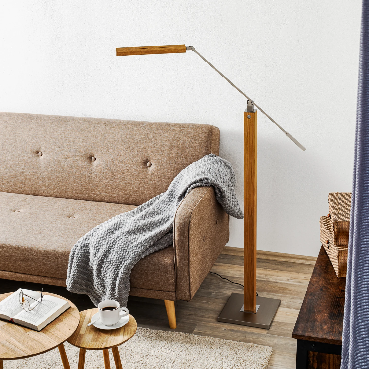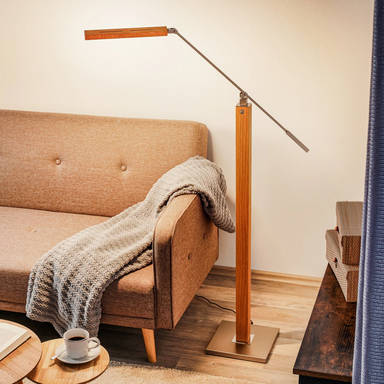 Der viereckige, nickelfarbene Metallfuß und der Ständer aus massivem Holz verleihen der LED-Stehleuchte Otto O eine solide Basis. Obenauf sitzt eine filigrane Metallstange, die am langen Ende den Kopf der Lampe mit dem LED-Leuchtelement trägt. Gegenüber ist ein längliches Gegengewicht aus Metall angebracht, das den Schwenkarm der Leuchte im Gleichgewicht hält. Der gesamte Arm der Leuchte kann geschwenkt und geneigt werden, sodass die Leuchte eine rundum flexible Beleuchtung bietet. Die für eine Stehleuchte relativ geringe Höhe der Leuchte ist bewusst so gewählt, um beim Lesen eine möglichst blendfreie und zielgerichtete Beleuchtung zu ermöglichen.