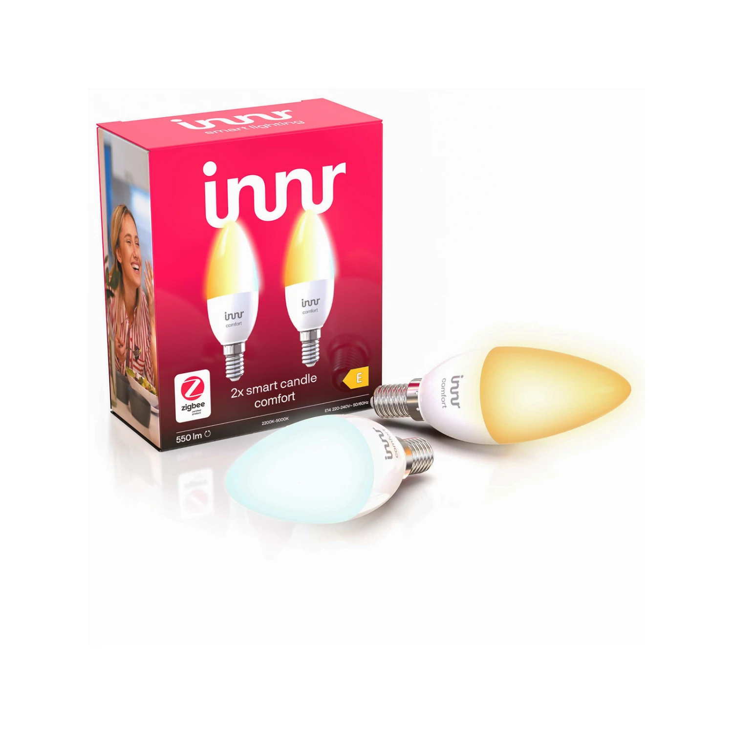 Gleich im Doppelpack kommt hier die LED-Kerzenlampe Smart Candle Comfort für E14-Fassungen. Sie lässt sich per App oder Sprachassistent ein- und ausschalten sowie dimmen. Darüber hinaus kann die Lichtfarbe von Warmweiß bis Universalweiß dank der integrierten CCT-Funktion eingestellt werden. Zur Nutzung dieser Funktionen ist eine zusätzliche Bridge (siehe Zubehör) nötig und die Einbindung in eine App.