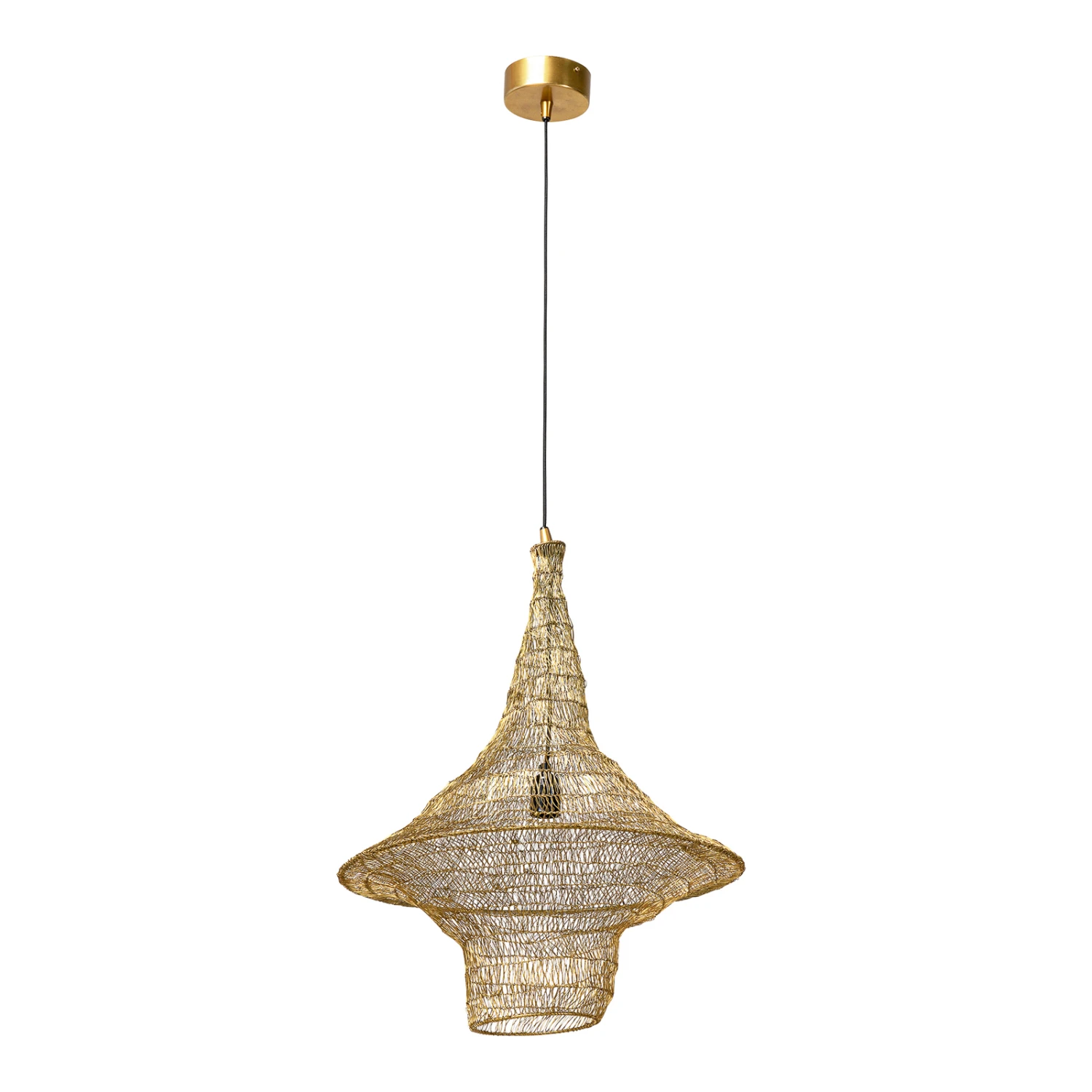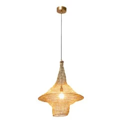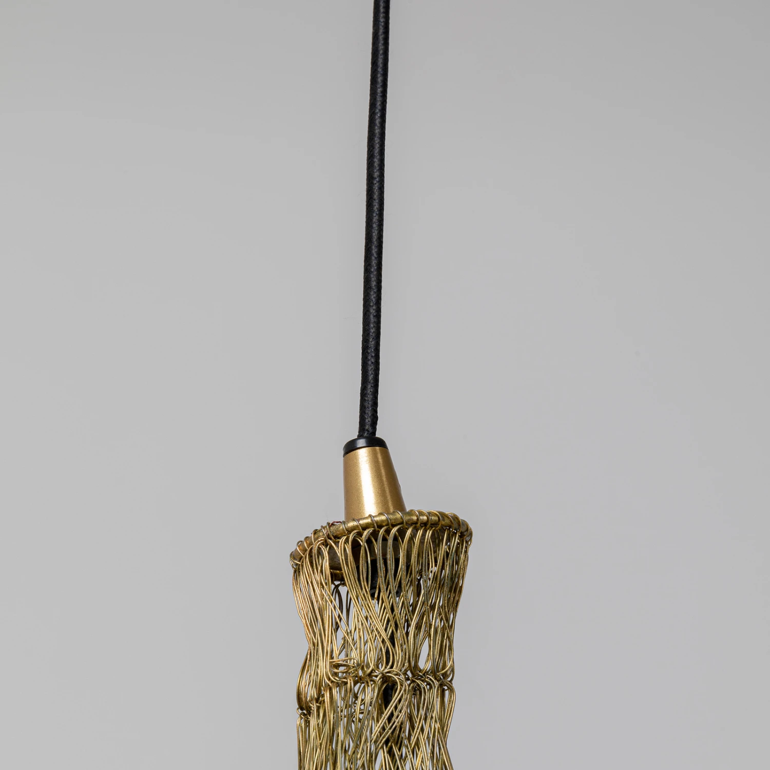 In Handarbeit wurde der Schirm der Hängeleuchte Cocoon aus feinem Stahlgeflecht geformt und abschließend goldfarben pulverbeschichtetet. Er läuft nach oben spitz und nach unten zu einer zylindrischen Form zusammen. Diese außergewöhnliche Form verleiht der Leuchte einen orientalischen Touch und lässt sie zu einem extravaganten Lichtspender über einem Tisch im Wohn- oder Esszimmer werden. Das eingesetzte Leuchtmittel (nicht enthalten) strahlt durch den Schirm ringsum in den Raum und lässt einen besonderen Lichtzauber entstehen.