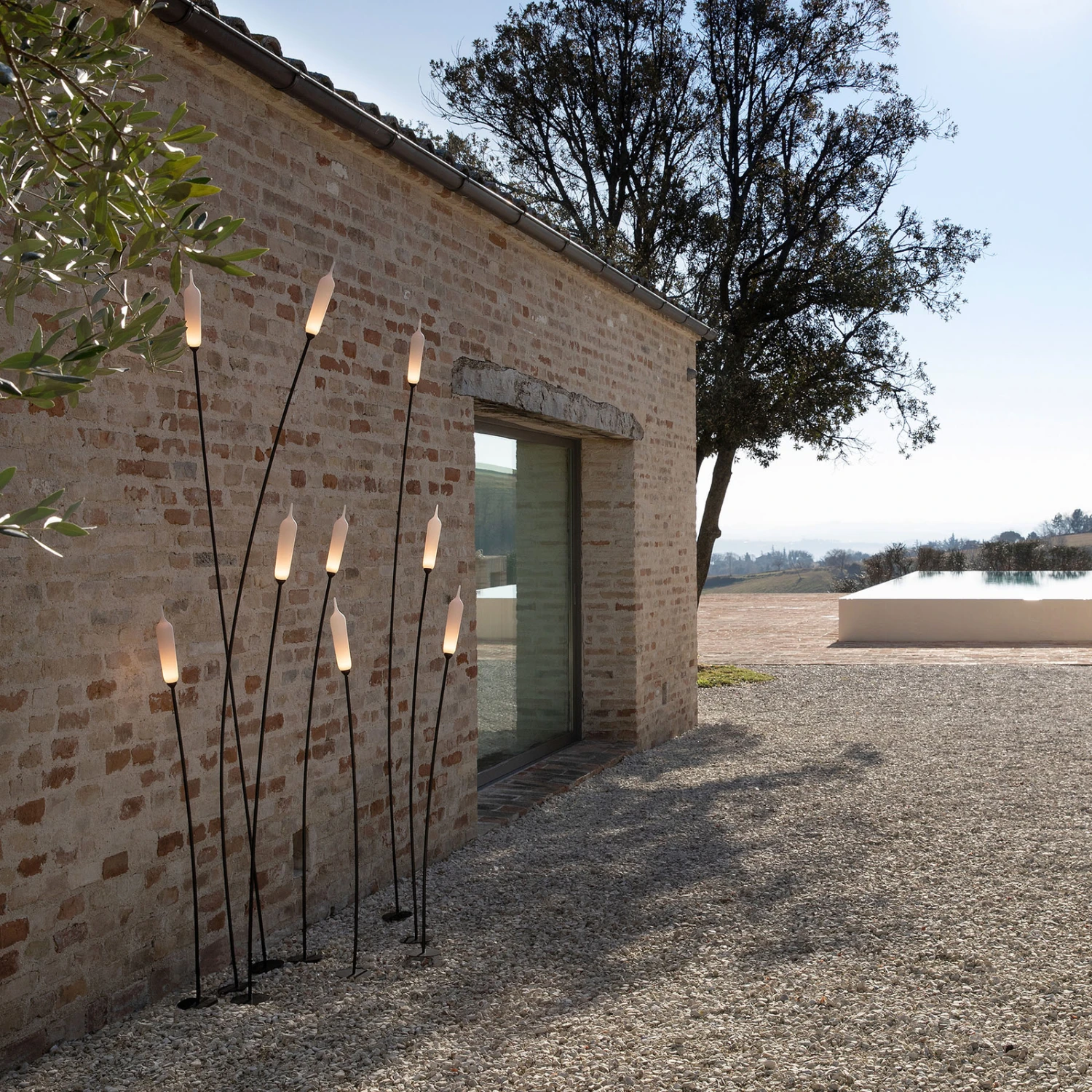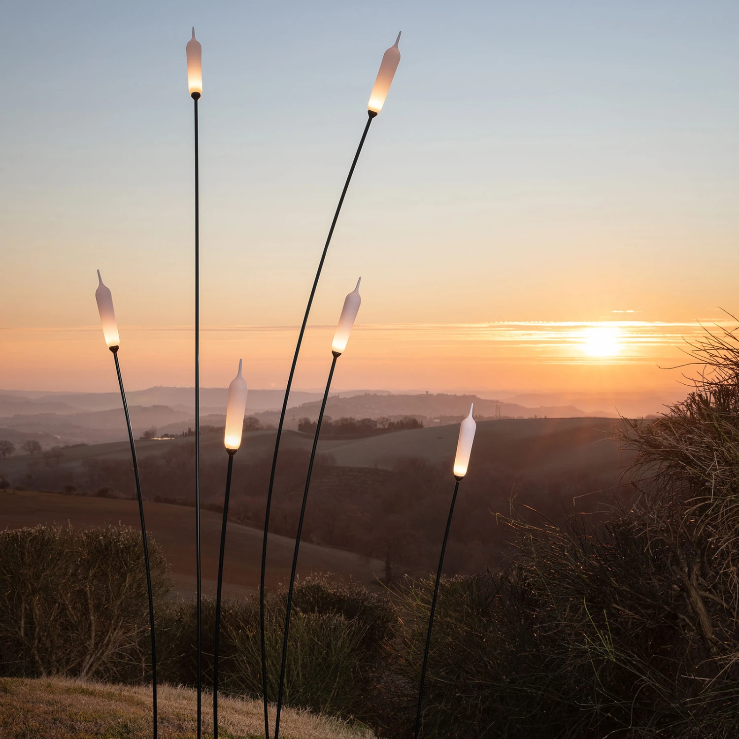 Die sehr natürlich gestaltete Designer-Stehleuchte Nilo ist mit hochwertigen Materialien gefertigt und mit effizienten LEDs versehen. Die Aluminiumstange ist grazil gearbeitet und erweckt das Gefühl, alles würde fließen, beweglich und leicht sein. Ihre geschwungene Form wird harmonisch von der feinen, einzigartig geformten Lichtquelle aus Harz ergänzt, die sich in gefrostetem Weiß präsentiert. Durch sie dringt etwa bis zur Hälfte des Leuchtenkopfes ein sanftes, warmweißes Licht nach außen. Inspirieren ließ sich der Designer Matteo Ugolini dabei von Erinnerungen, die ihn an einen Ort in Italien an einem Nachmittag im Sommer zurückführen, wo er die Harmonie zwischen Flüssen und Pflanzen und dem Aufleben der Menschen beobachten konnte. Das Erscheinungsbild von Nilo gleicht hohem Schilf oder auch eindrucksvollen Pflanzen, wodurch sie sich ideal für die Dekoration im Garten eignet.