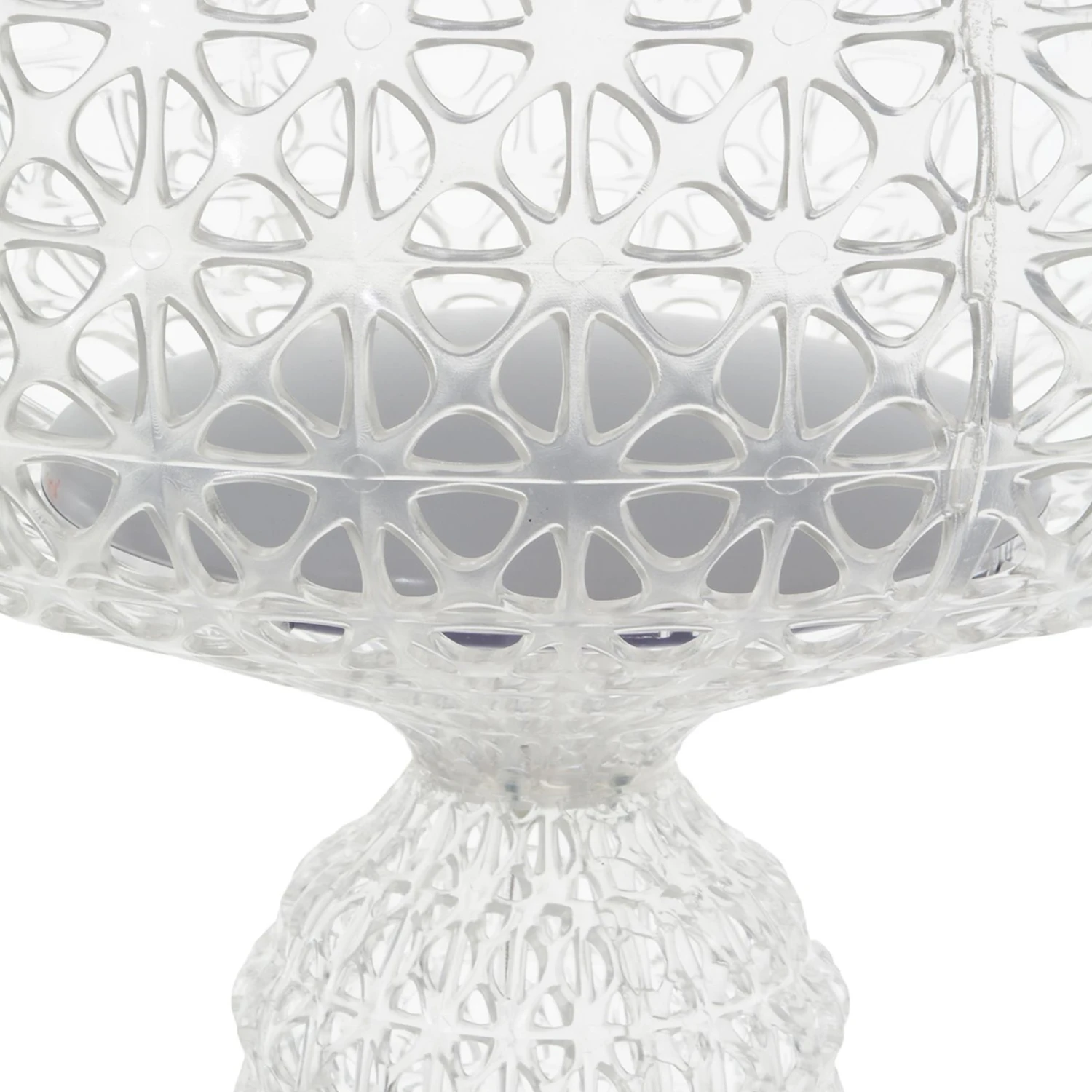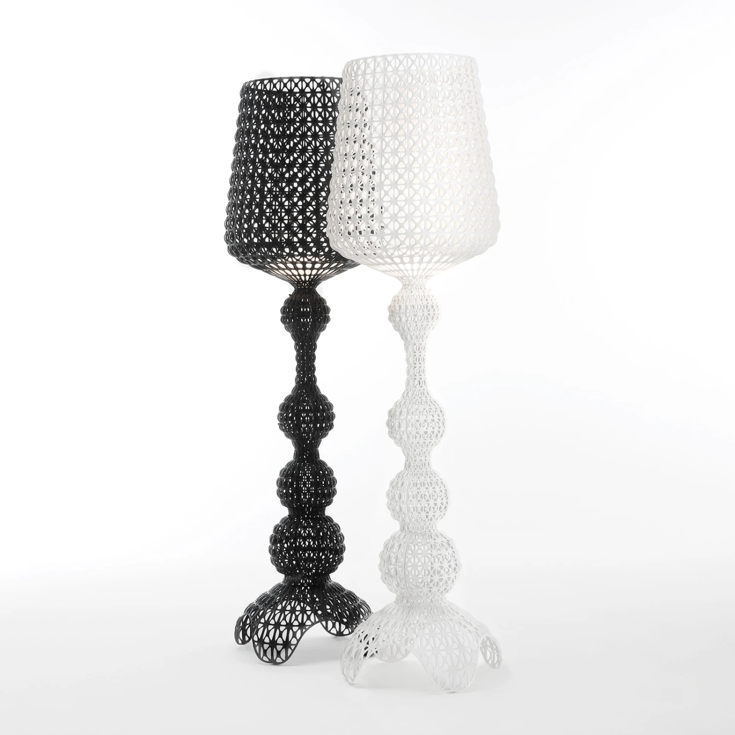 Ihre Silhouette lässt einen an opulente Beleuchtungselemente aus barocken Zeiten denken. Die LED-Stehleuchte vereint nämlich klassisches, verspieltes Design mit moderner Technik und modernen Materialien. Während die Struktur von Schirm und Gestell an edle Spitze erinnert, ist das Material in Wirklichkeit nicht Textil, sondern thermoplastisches Technopolymer, das im Spritzgussverfahren verarbeitet wurde. Die vielen kleinen Auslassungen im Schirm ergeben ein ansprechendes Lichtmuster, wenn die Leuchte eingeschaltet ist.