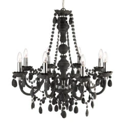 In der für einen Kronleuchter ungewöhnlichen Farbe Dunkelgrau mit matter Oberfläche präsentiert sich der sehr klassisch gestaltete Kronleuchter. Diese Gegensätze machen aus dem Kronleuchter Marie Therese eine auffällige Erscheinung, die zum Mittelpunkt des Raumes wird. Über einem Tisch angebracht, spendet er durch die frei in den Kerzenschäften sitzenden Leuchtmittel (nicht enthalten) eine schöne Allgemeinbeleuchtung, die auch für größere Räume ausreicht. Ebenso prachtvoll wirkt der Kronleuchter Marie Therese in einem großen Flur bzw. einer Eingangshalle. Der zahlreiche Behang in Form von Tropfen, flachen und runden Elementen aus Acryl, die teilweise zu Ketten aufgereiht wurden, ziert den achtarmigen Kronleuchter zusätzlich.
