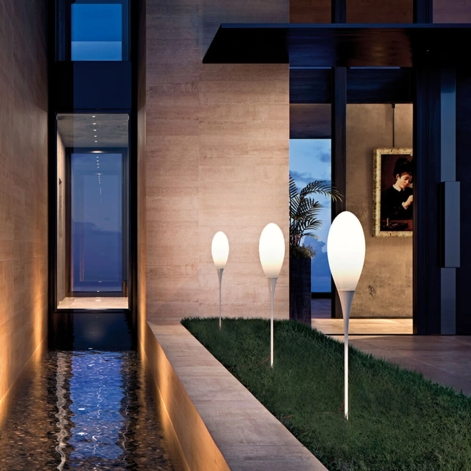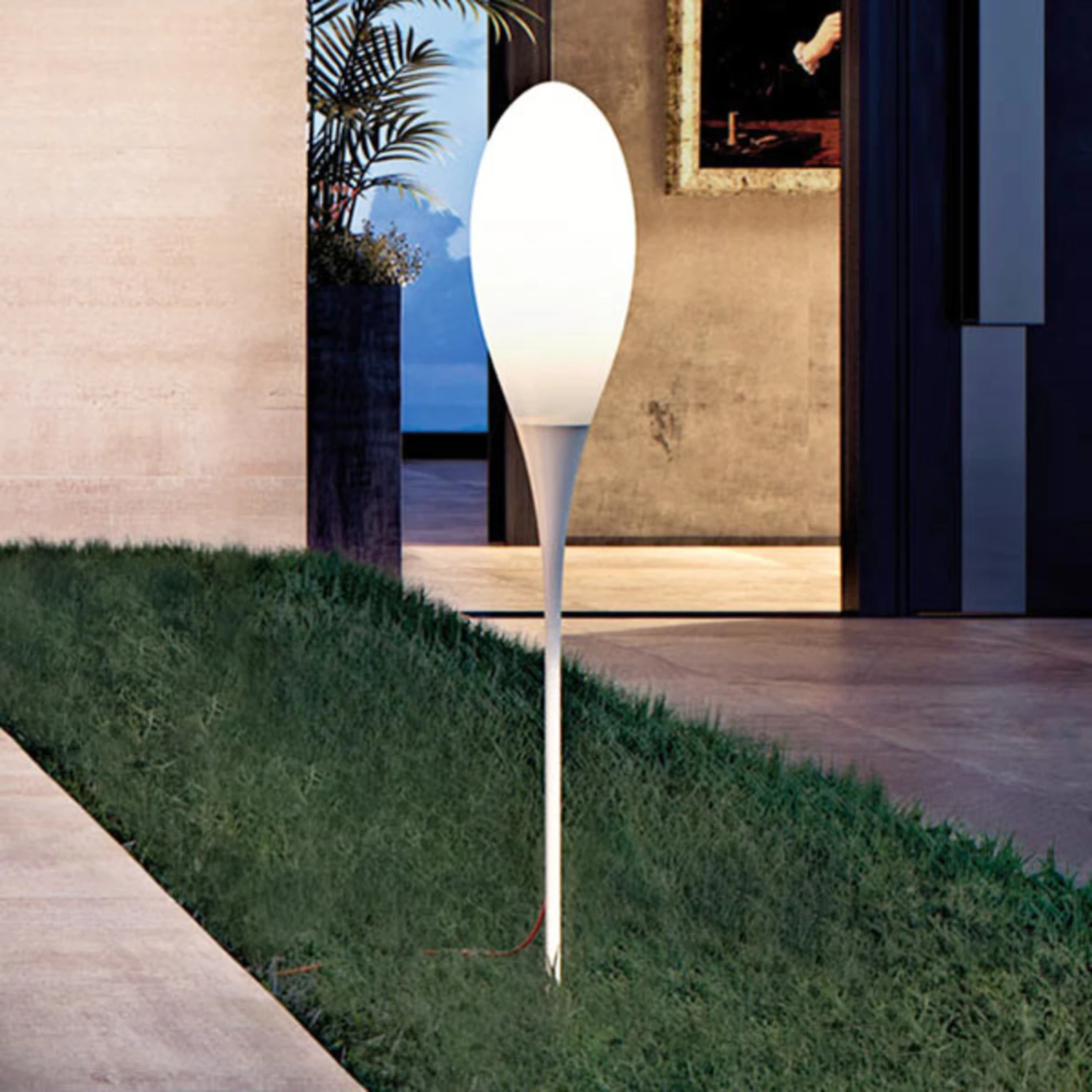 Dass Wegeleuchten für den Außenbereich nicht immer rustikal und massiv wirken müssen, stellt das Modell Spillo vom Mailänder Hersteller Kundalini eindrucksvoll unter Beweis. Diese Leuchte überzeugt auf Anhieb durch ein anmutiges und filigranes Design, das man nur selten in der Welt der Außenleuchten vorfindet. Das Herzstück der Wegeleuchte Spillo ist der tropfenförmige Diffusor, der aus Polyethylen gefertigt wurde. Dieses Material und die hochwertige Verarbeitung sorgen dafür, dass es die Leuchte mit jeder Witterung aufnehmen kann. Komplettiert wird die Leuchte durch eine Bodenstange aus Stahl. Diese ermöglicht es, dass Spillo überall dort, wo es weichen Boden gibt, montiert und immer wieder neu postiert werden kann. Die Leuchte eignet sich dementsprechend hervorragend für den Einsatz im Garten.