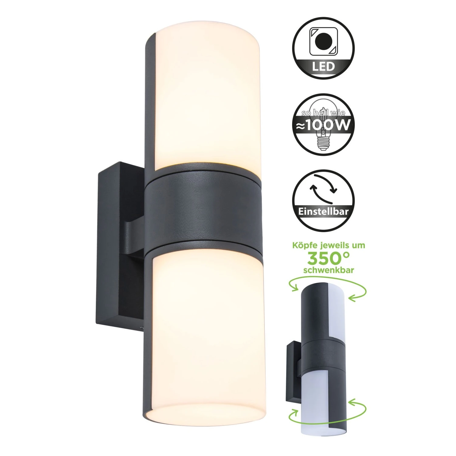 Ideales Licht für den Außenbereich: Die Wandleuchte Cyra ist perfekt geeignet für die Beleuchtung im Eingangsbereich, an Häuserfassaden oder im Bereich der Terrasse. Die runde, schmale Form wirkt dabei besonders elegant und nicht aufdringlich. Für die nötige Sicherheit sorgen die beiden hell strahlenden LEDs, die in zwei unabhängigen Leuchtköpfen untergebracht sind. Diese lassen sich jeweils bequem zur Seite hin um 350° drehen und ermöglichen somit eine individuelle Ausrichtung des Lichts.