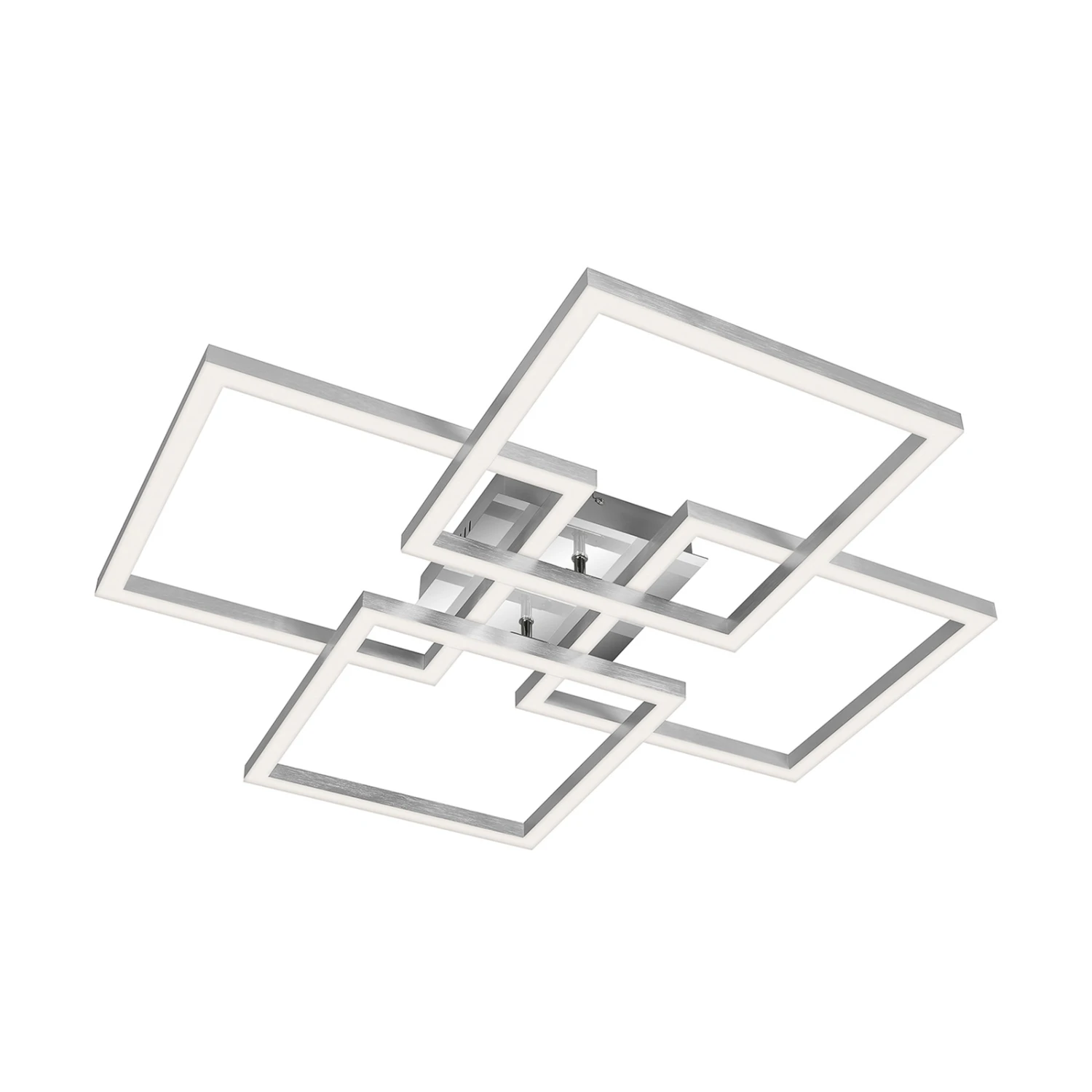 Die LED-Deckenleuchte Frame setzt sich aus vier schmalen Quadraten zusammen, die sich gegenseitig überlagern, wodurch eine interessante und zugleich dekorative Leuchtenform entsteht. Zwei der vier Rahmen sind schwenkbar, wodurch die Optik der Leuchte nach den eigenen Vorstellungen verändert werden kann. Die Deckenhalterung ist ebenfalls quadratisch gestaltet und überzeugt durch ihre edle Farbgestaltung in Chrom. Frame kann in unterschiedlichen Wohnbereichen eingesetzt werden und macht beispielsweise als Lichtspender im Ess- oder Wohnzimmer, im Flur oder im Schlafzimmer eine gute Figur.