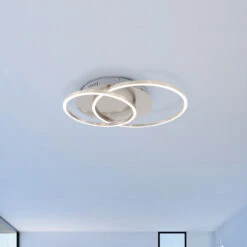 Die LED-Deckenleuchte Frames besteht aus zwei großen Ringen, die übereinander versetzt angeordnet und mit LEDs bestückt sind. Die Leuchte kann ein hohes Maß an Helligkeit erzeugen, so dass auch größere Räume die passende Ausleuchtung erfahren. Bei Bedarf hat man die Möglichkeit, die Helligkeit über den Wandschalter in Stufen anzupassen. Mit ihrem Design ist die Deckenleuchte für den Einsatz in modernen Wohnbereichen geeignet.