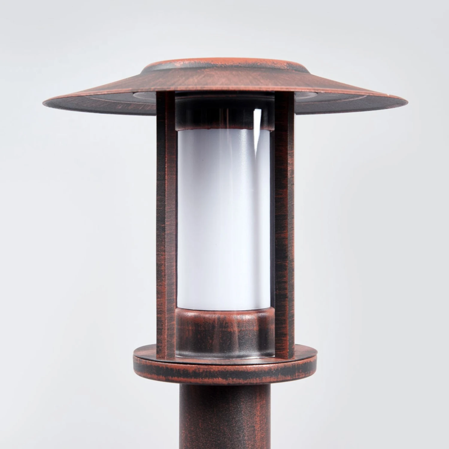 Optisch strahlt die LED-Sockellampe etwas Rustikales aus, wozu auf nicht unerhebliche Weise der Rostton der Oberfläche beiträgt. Die Form der Leuchte mit dem Dach an der Oberseite verstärkt diese Wirkung und dank der LEDs ist die Sockelleuchte eine energiesparende Außenleuchte, die Hof und Garten gut ausleuchtet.