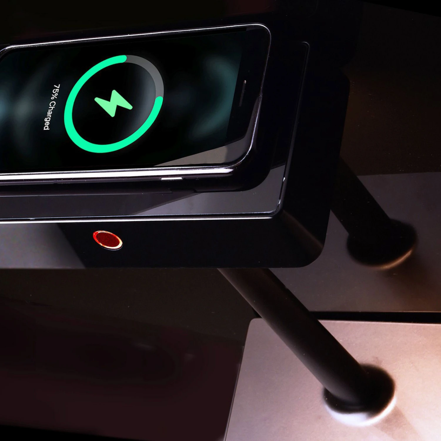 Die moderne LED-Tischleuchte Algieba überzeugt auf ganzer Linie. Sie kann flexibel genutzt werden, ob im Innenbereich oder auch außen auf der Terrasse oder dem Balkon. Dank des integrierten Akkus, der mit einer Laufzeit von ungefähr 10 Stunden ausgestatttet ist, kann sie überall platziert werden. Das Aufladen geschieht spielend leicht mit einer mitgelieferten Ladebase. Das Licht der integrierten, warmweißen LEDs kann hier zudem mit einem Touch-Schalter stufenlos gedimmt werden. Super praktisch ist das kabellose Laden des eigenen Smartphones auf der Oberseite des Lampenschirms. Die Ladefunktion kann hierbei optional über einen Schalter ein- und ausgeschaltet werden.