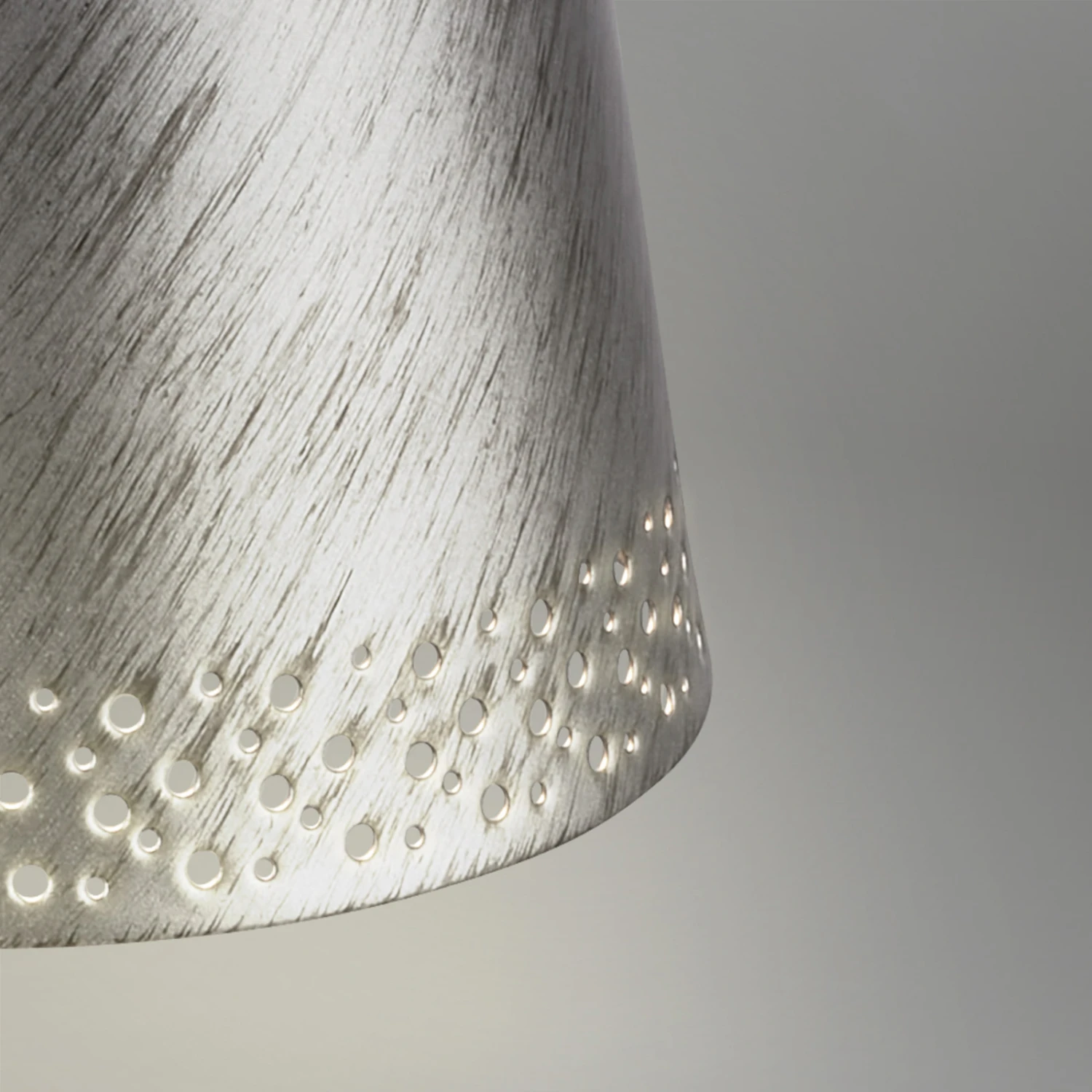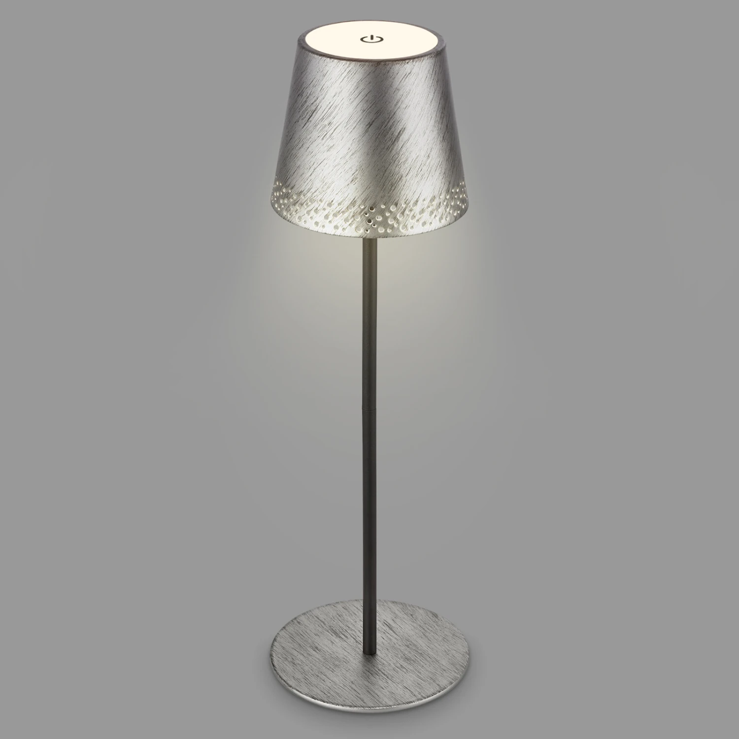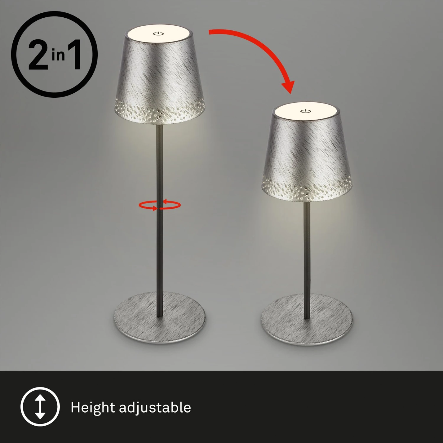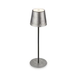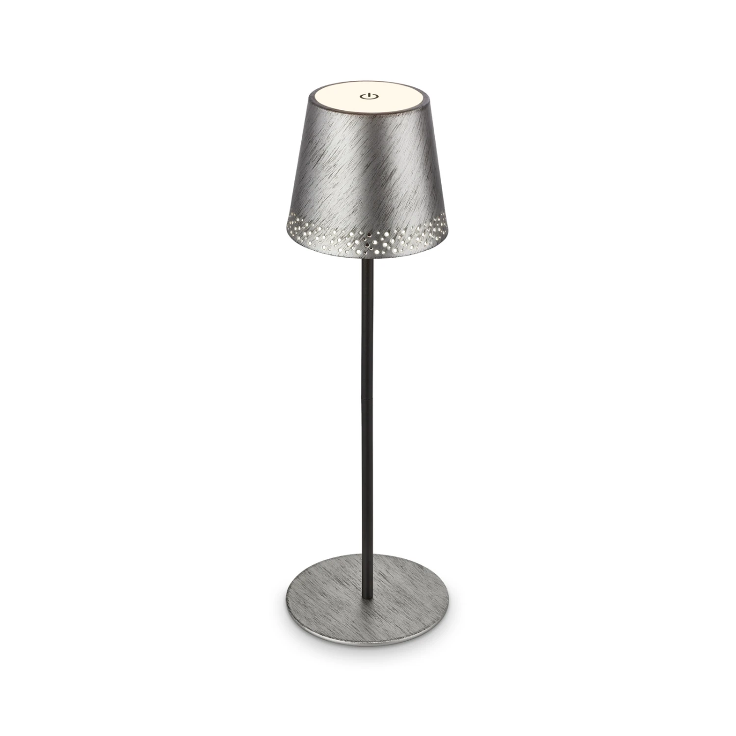 In Innenräumen lässt sich die akkubetriebene LED-Tischleuchte Kiki ebenso nutzen wie dank Schutzart IP44 im Garten oder auf der Terrasse. Die schöne Perforierung mit einem feinen Lochmuster am unteren Rand des Schirms verleiht der Leuchte eine leicht romantische Note, das zweiteilige Gestell mit Schraubverbindungen ermöglicht eine variable Höhe – montiert man eine Stange, ist die Leuchte 22 cm hoch, werden beide Stangen montiert, ist sie 38 cm hoch.