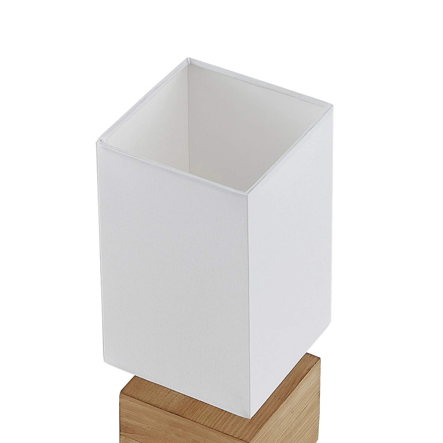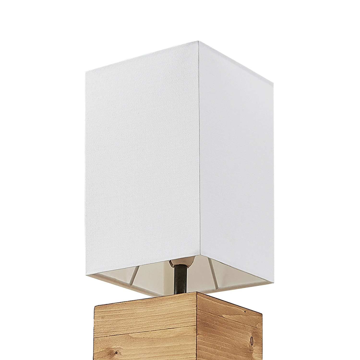 Der Schirm aus weißem Textil bildet einen schönen Kontrast zum Leuchtenfuß aus Kiefernholz. Diese gegensätzlichen Materialien und Farben bilden optisch eine Einheit und wirken zusammen gemütlich und schlicht.