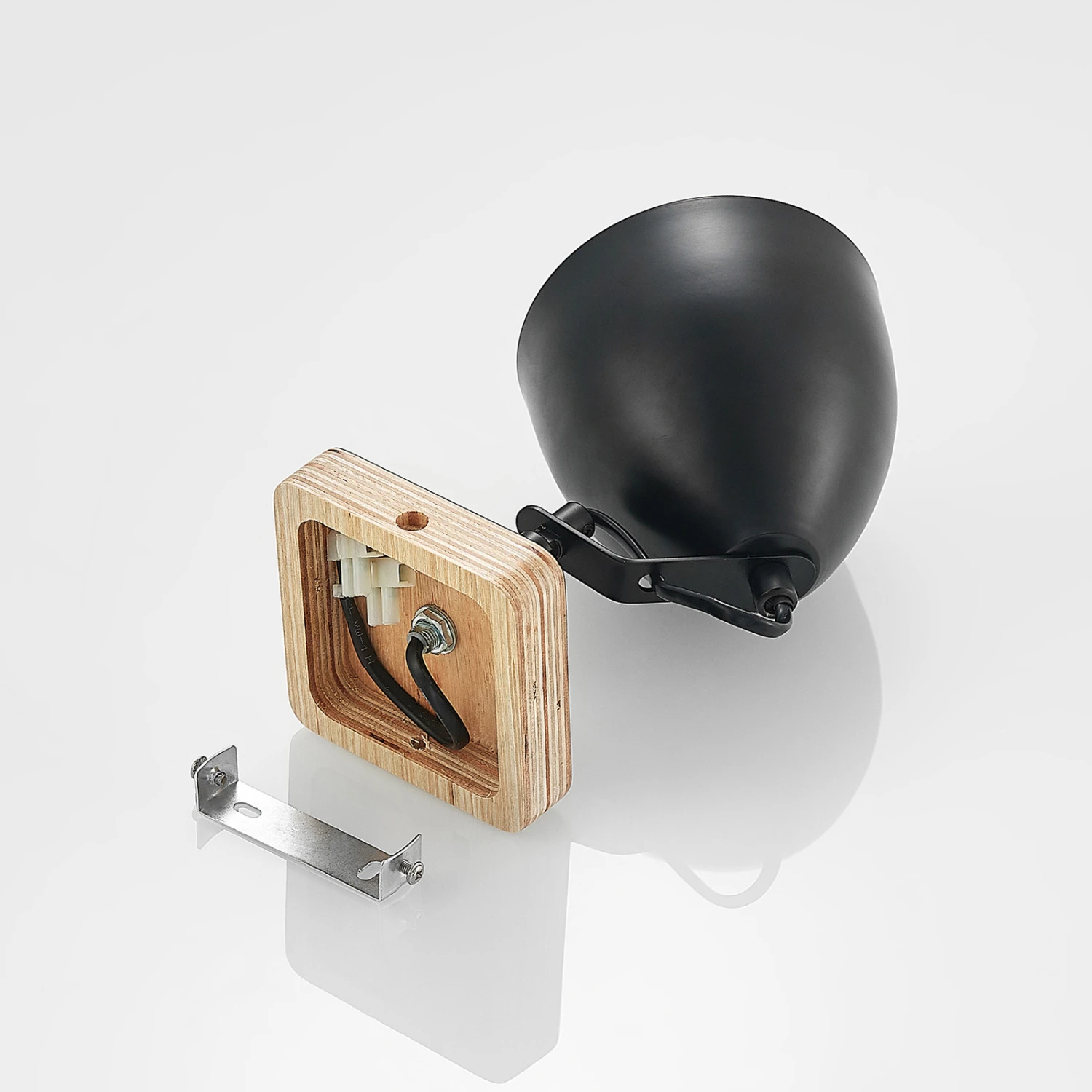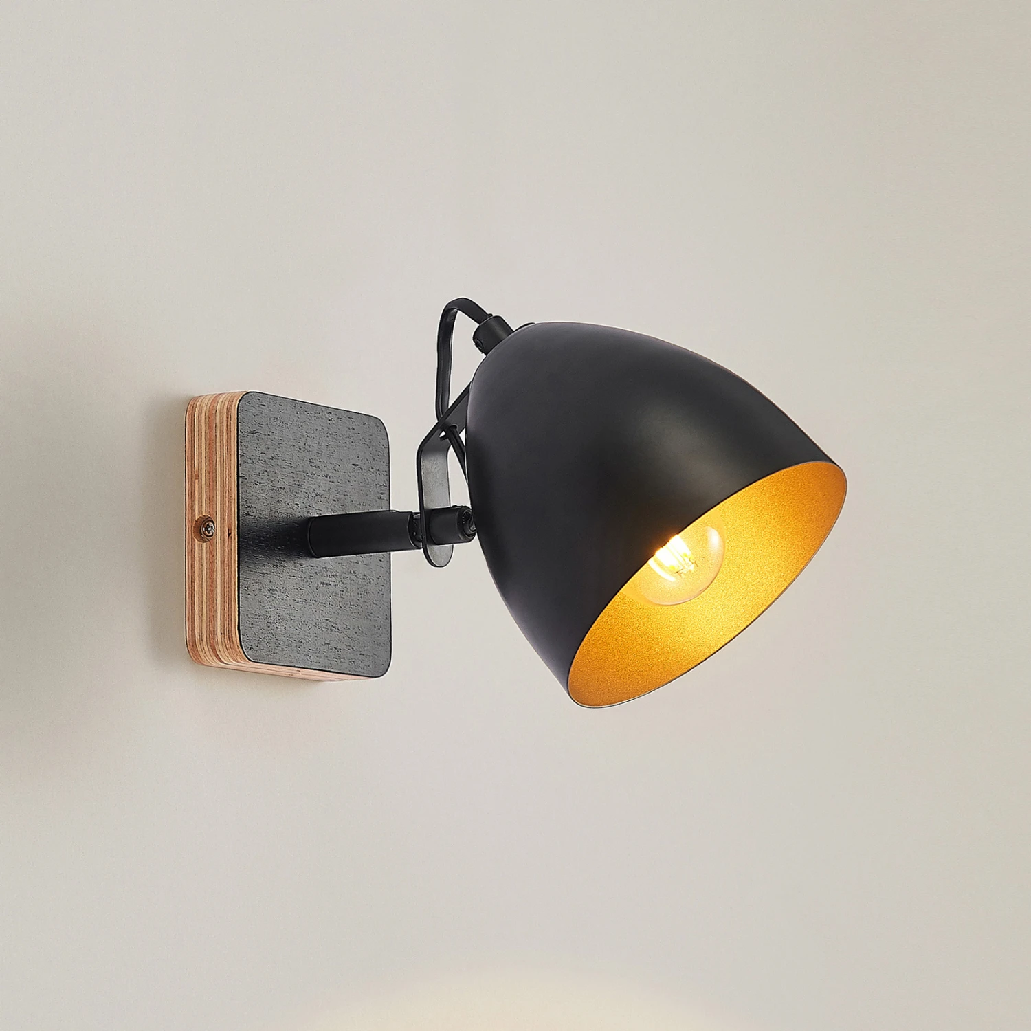 Einflammiger Strahler Colton mit schwarz-goldenem Eisenschirm und Holzelement