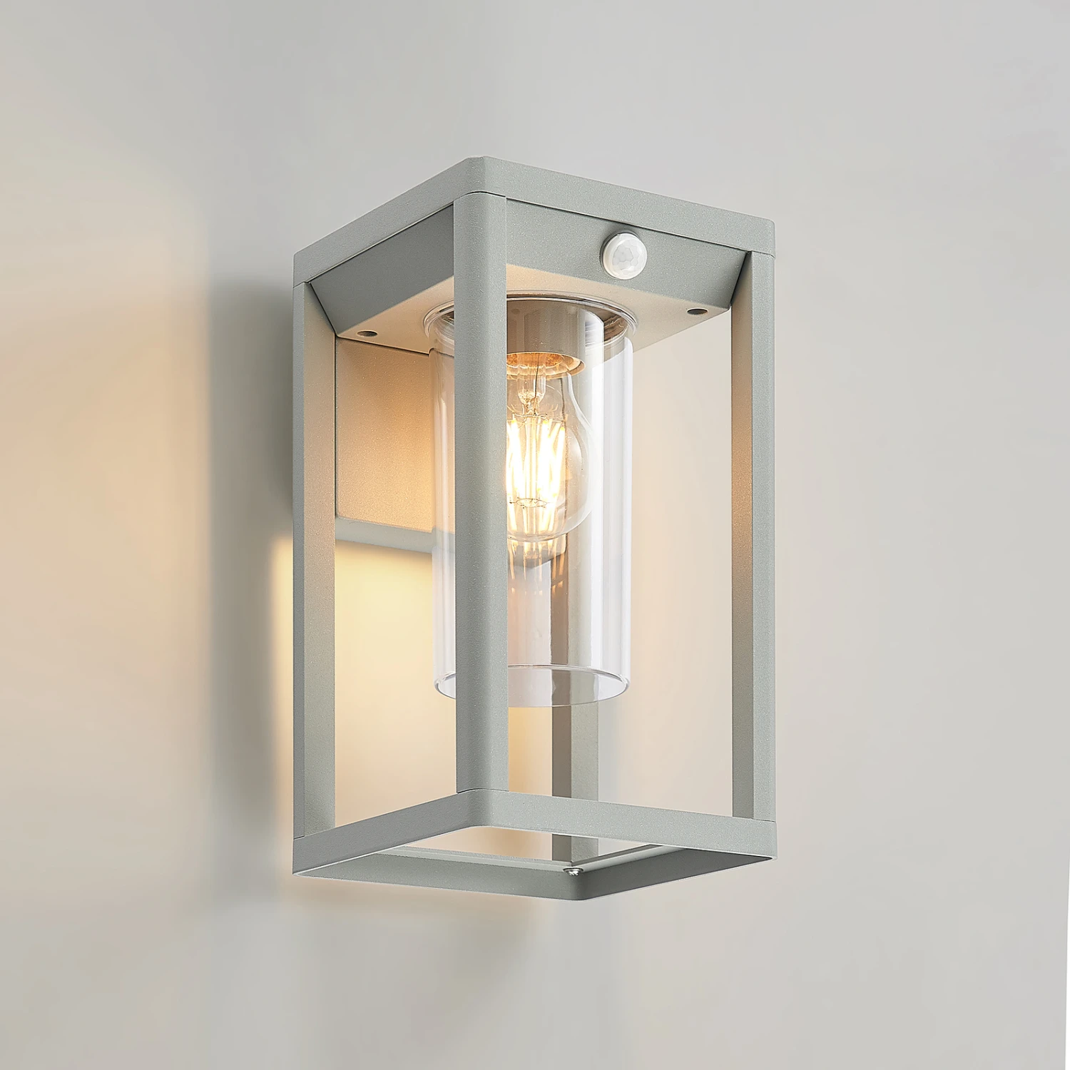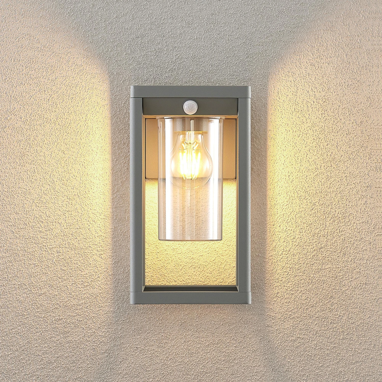 Graue Außenwandleuchte Estami mit integriertem Bewegungsmelder
