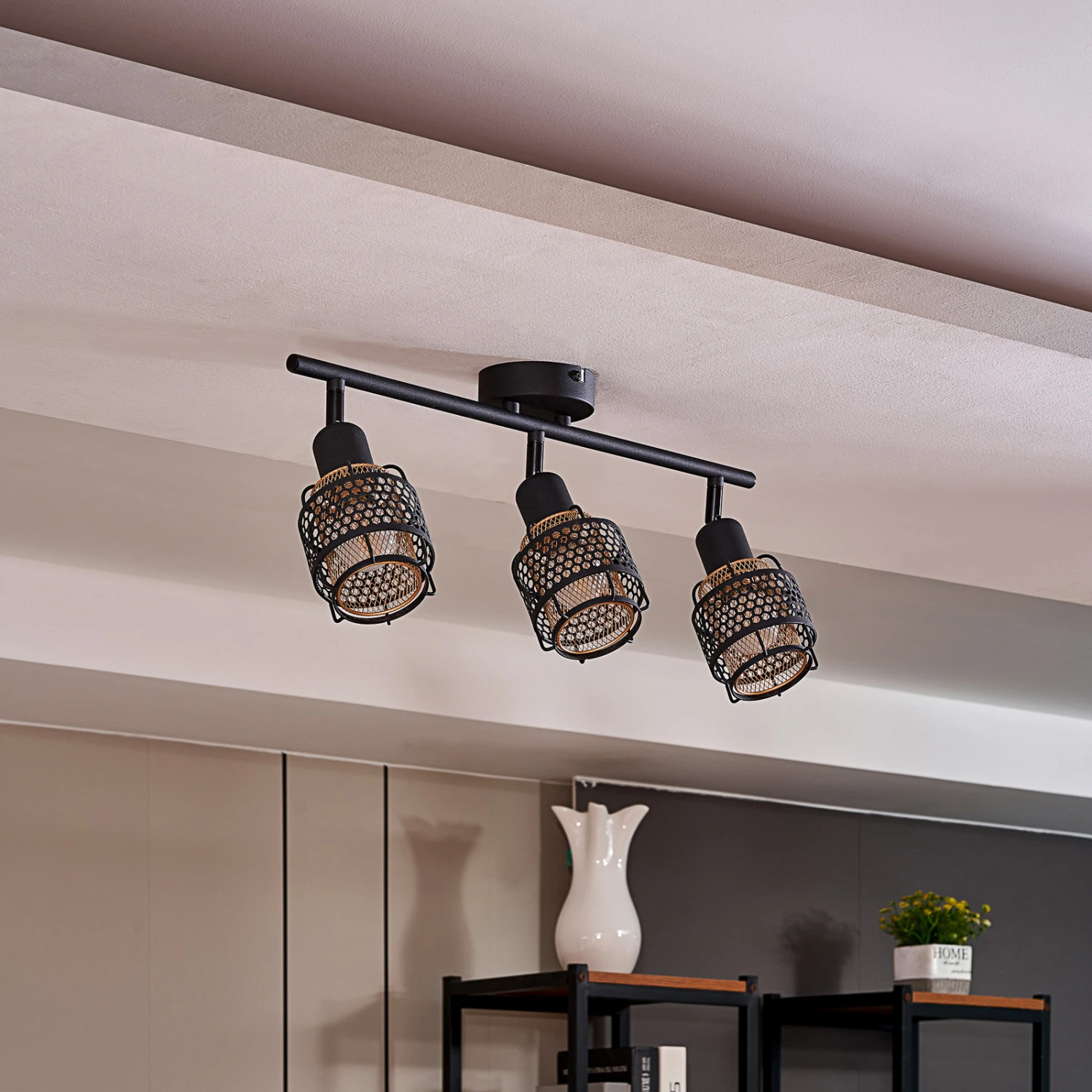Der aus Eisen hergestellte Deckenspot Eudoria überzeugt mit seinem aufsehenerregenden Aussehen und verleiht der Inneneinrichtung das gewisse Etwas. Er besteht aus einer Strebe, die an einer runden Deckenhalterung angebracht ist und an der drei Leuchtenschirme sitzen. Diese Schirme sind das Besondere Detail des Strahlers. Sie bestehen aus jeweils zwei Schirmen, die ineinander angebracht sind und darüber hinaus ein gestanztes Muster besitzen. Durch dieses Muster entsteht durch das generierte Licht ein spannendes Lichtspiel, dass sich im Raum verbreitet. Der Deckenstrahl Eudoria kann mit E14-Leuchtmitteln bestückt werden.