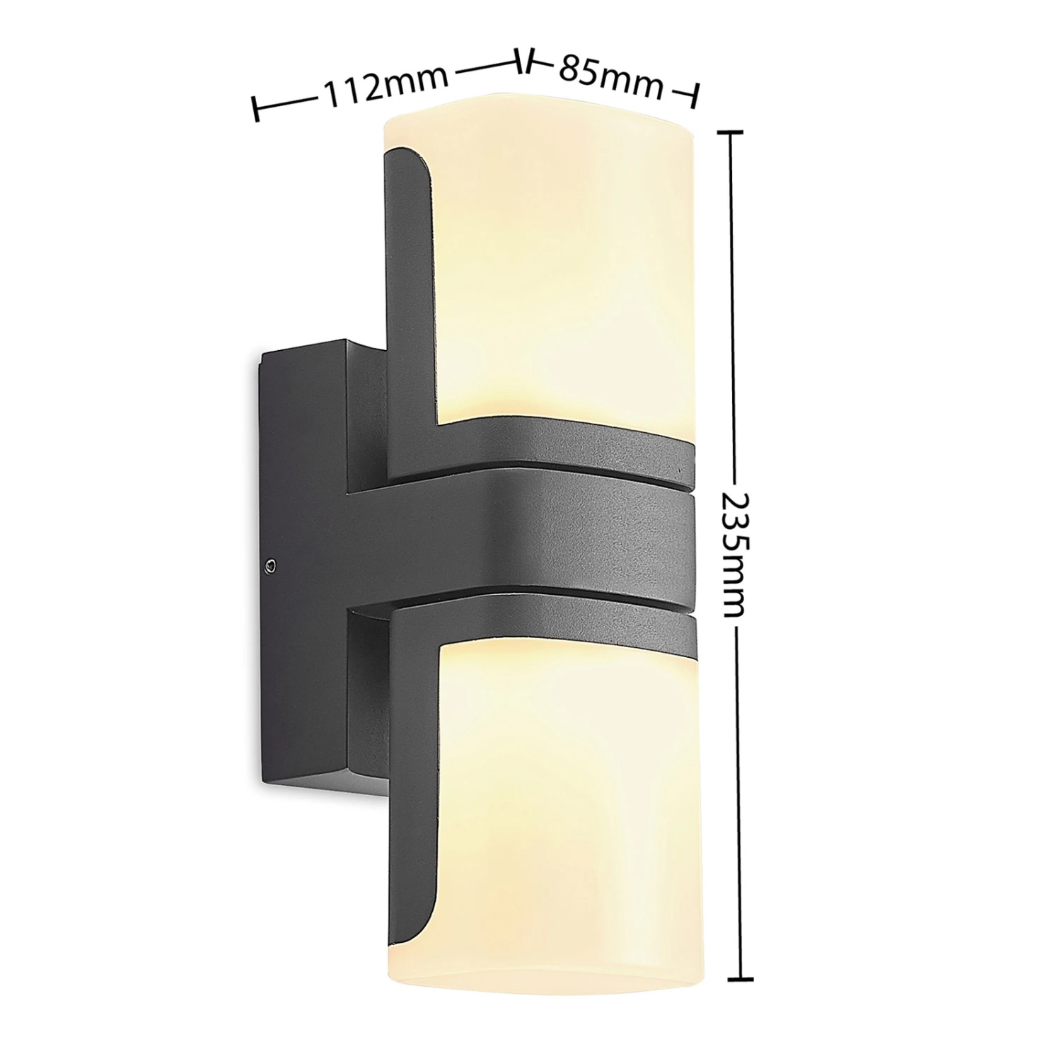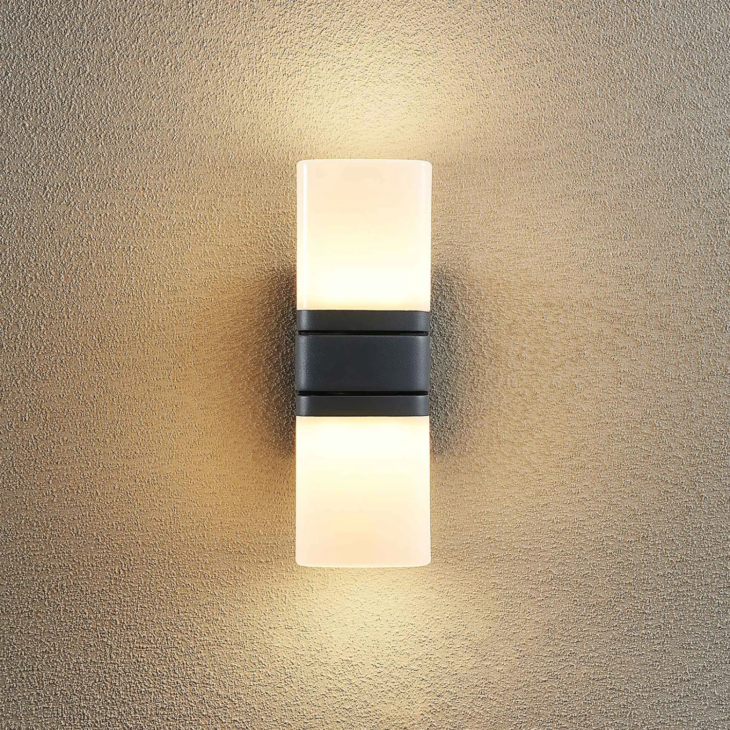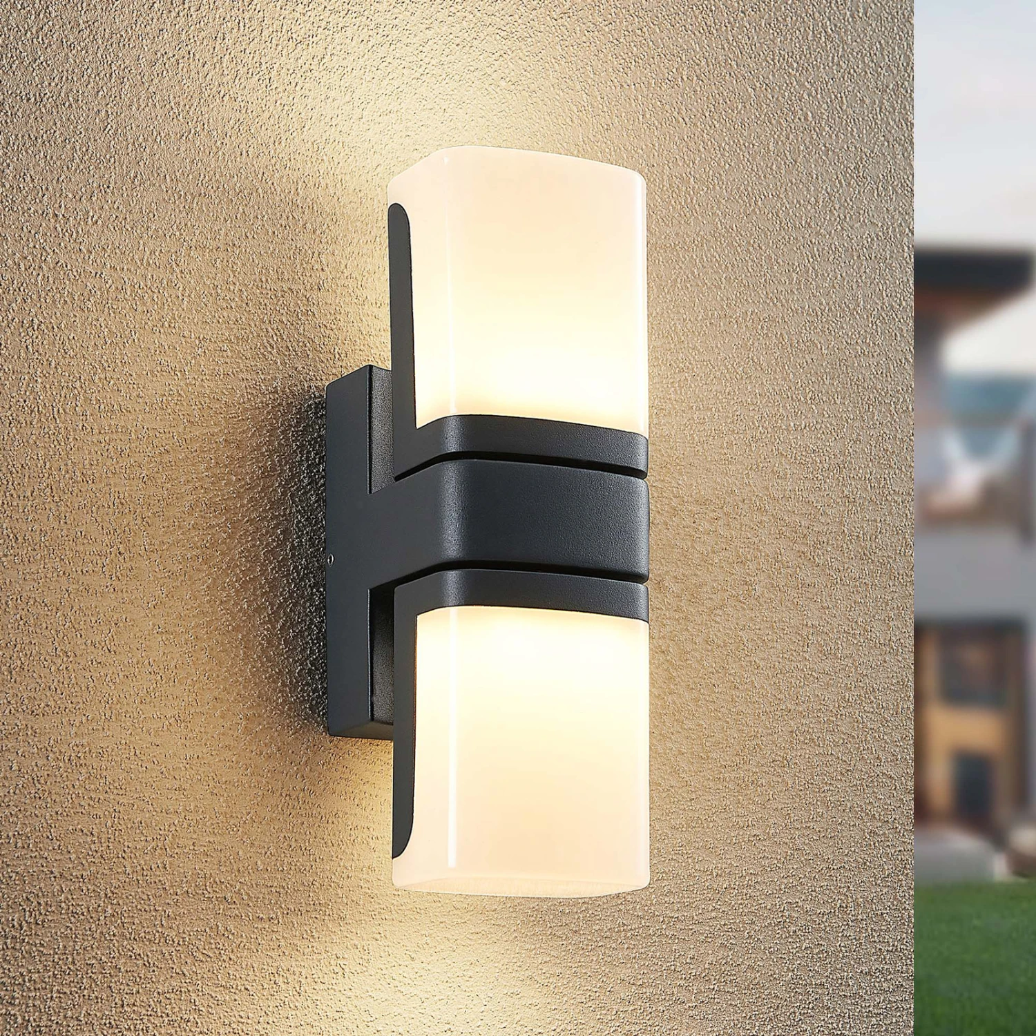 Jasiah besteht aus Aluminium und Kunststoff und ist in einem stimmigen Schwarz gehalten. Ihre festverbauten LEDs sitzen in zwei drehbaren Köpfen, die eine flexible Beleuchtung ermöglichen. Die LED-Außenwandlampe generiert ein warmweißes Licht, welches sich hervorragend für den Außenbereich geeignet ist, wenn ein gemütliches Ambiente erzeugt werden möchte. Die Schutzart IP54 geschützt die Leuchte gegen Staub und Spritzwasser und macht sie perfekt für eine überdachte Einfahrt oder Terrasse. Die Farbkombination aus Dunkelgrau und dem Weiß des Kunststoff-Diffusors rundet das moderne Design der LED-Außenwandleuchte Jasiah ab.