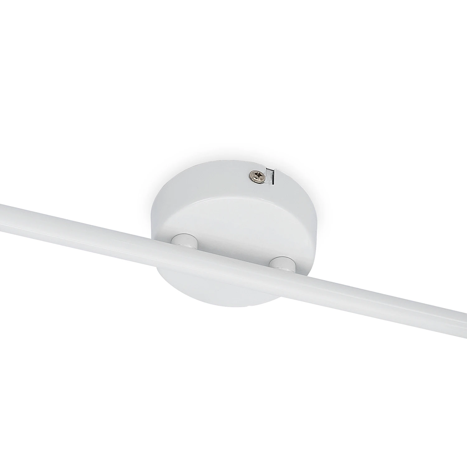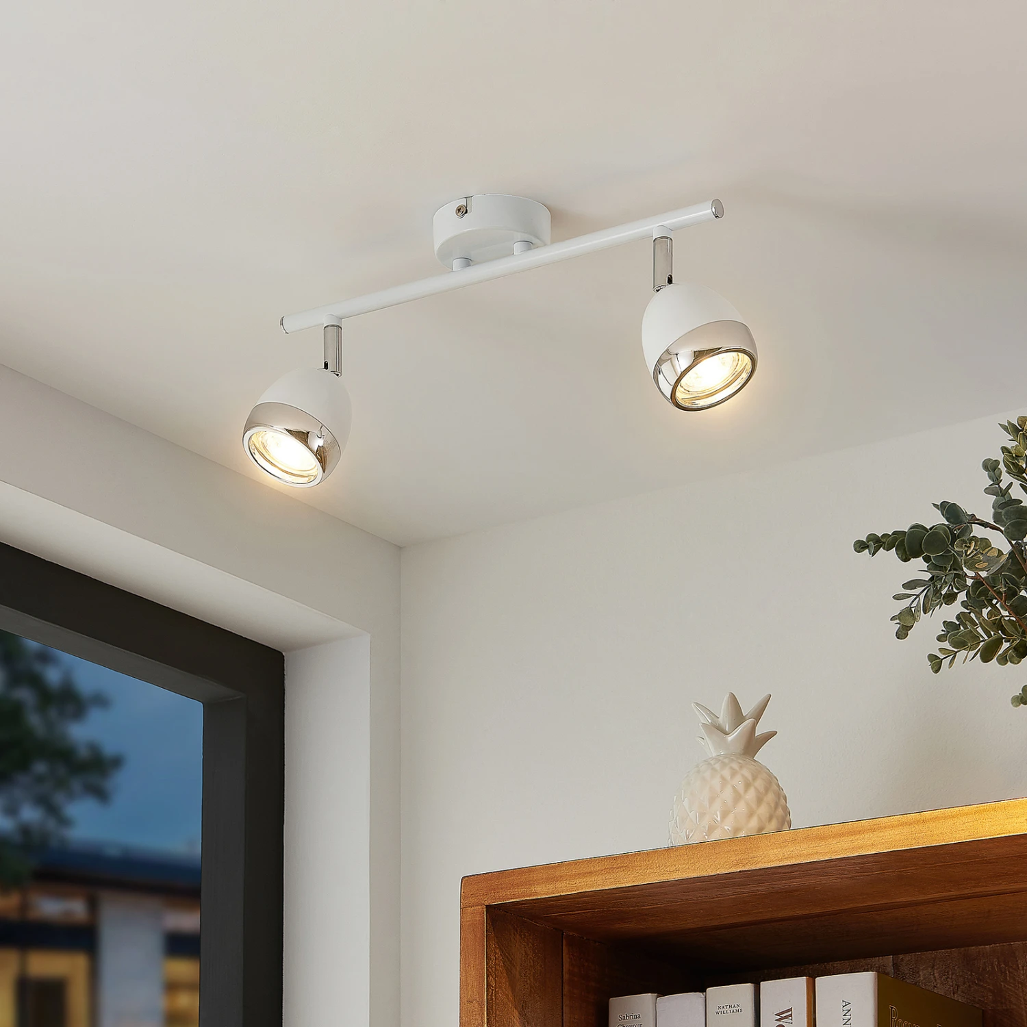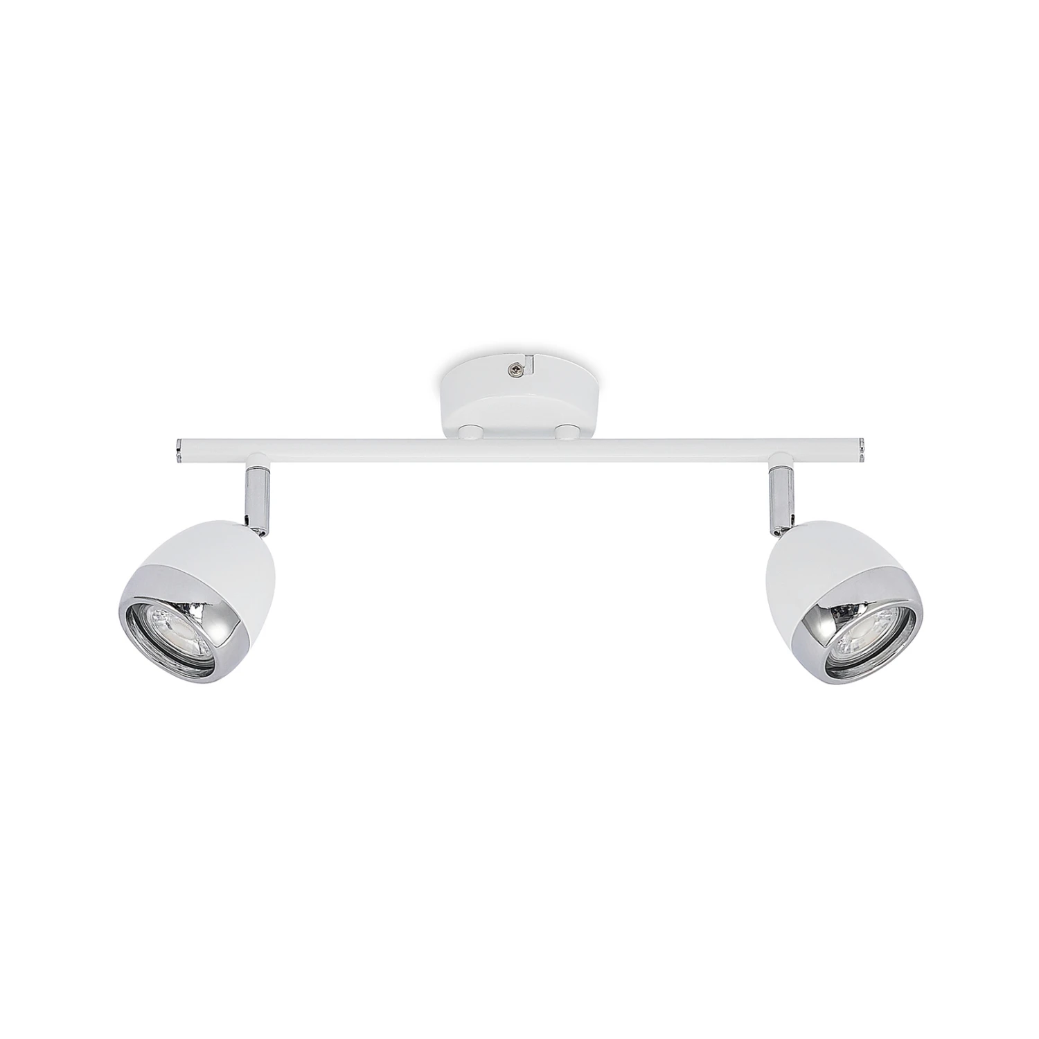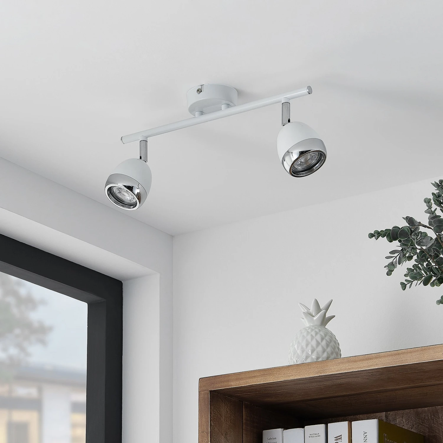 Der Deckenstrahler Khaled kommt in einem schlanken, weitläufigen Design und überzeugt mit seinem eleganten Aussehen. An einer runden Deckenhalterung ist eine längliche Strebe horizontal angebracht und trägt zwei Leuchtenschirme an ihren Enden. Der komplette Leuchtenkörper besteht aus Stahl und ist in weiß gehalten, währenddessen am oberen Rand der Lampenschirme jeweils ein chromfarbener Ring angebracht ist, der der Optik das gewisse Etwas verleiht. In die Leuchte können GU10 Leuchtmittel eingesetzt werden und sorgen für die entsprechende Ausleuchtung. Das weitläufige Äußere des Deckenspots Khaled und sein elgantes Design lassen sich mühelos in moderne Einrichtungsstile integrieren und finden vor allem in länglich geschnittenen Räumen einen perfekten Platz.