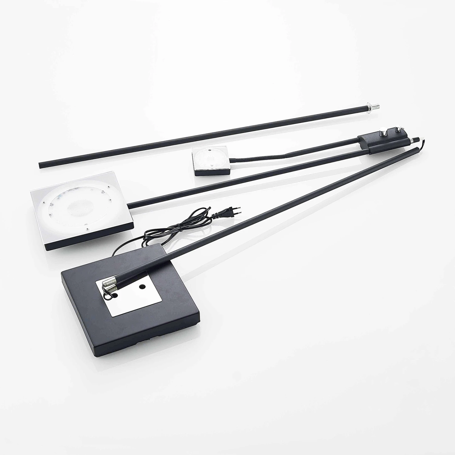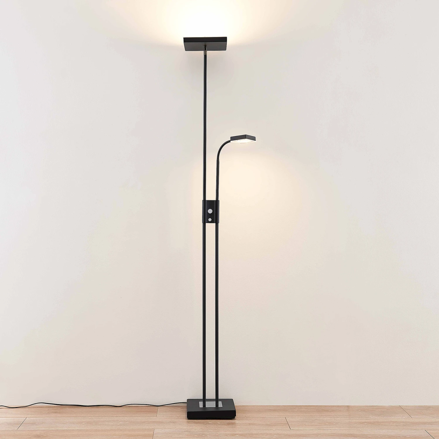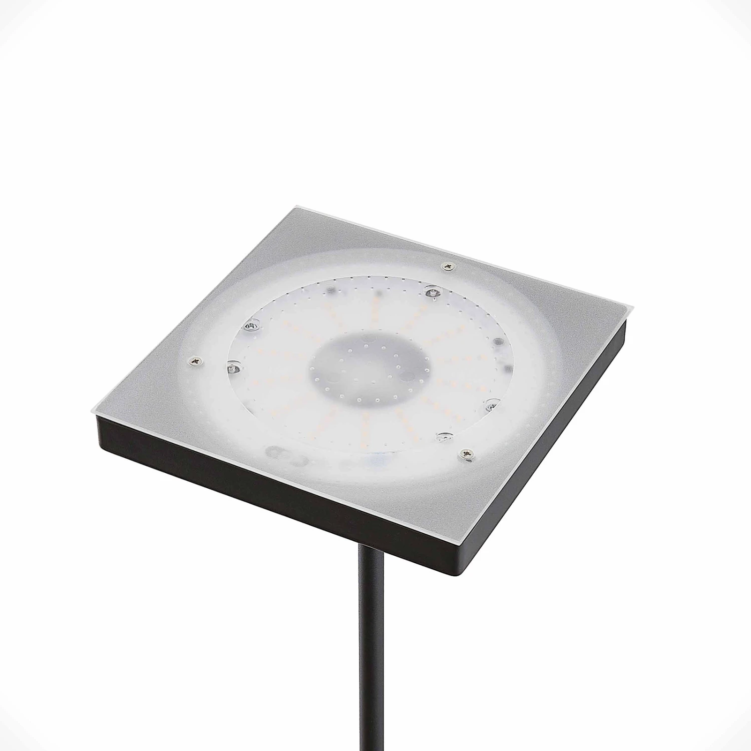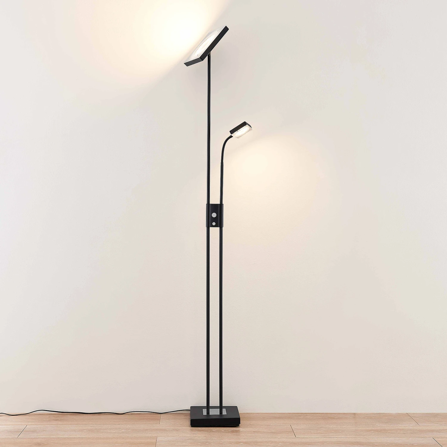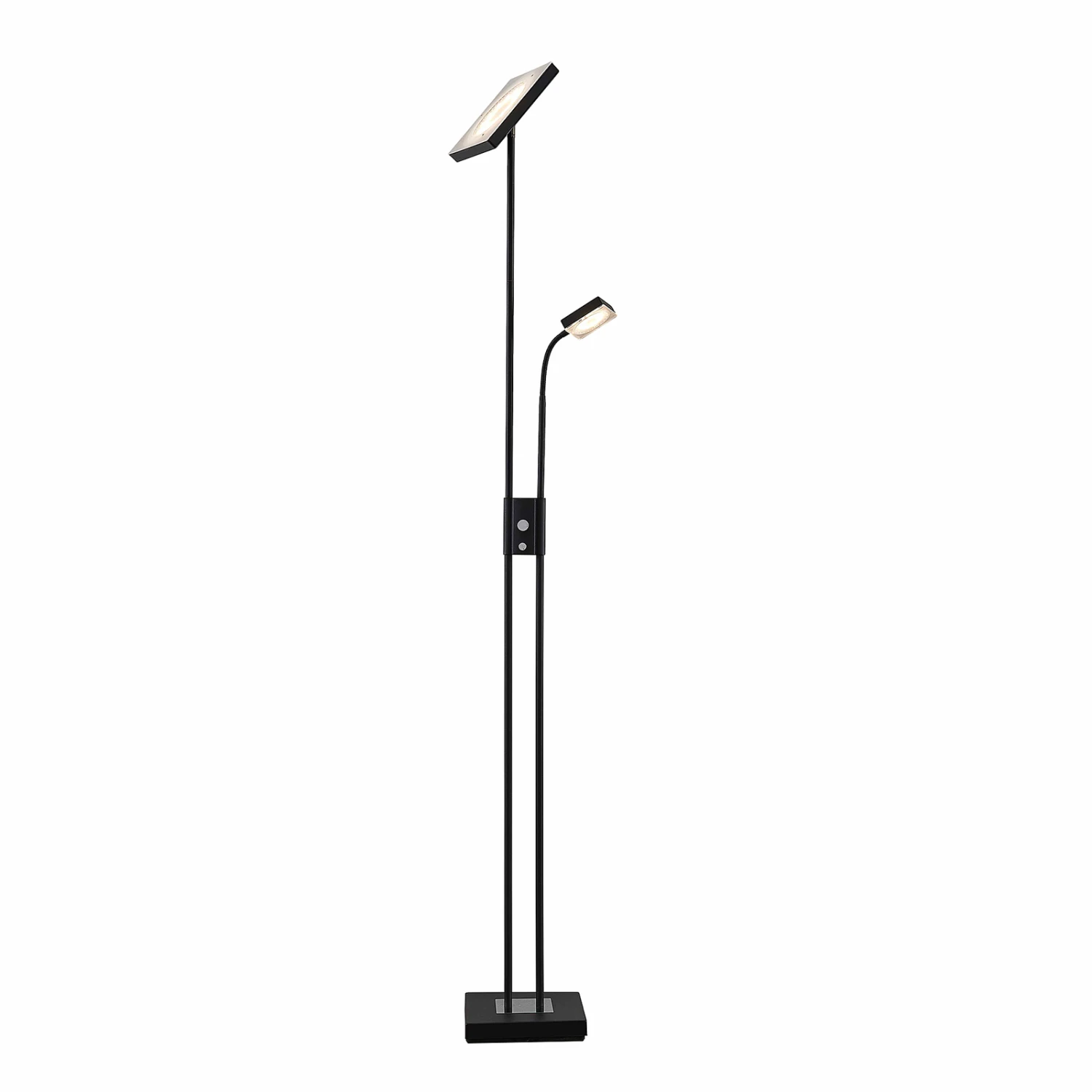 In einer eckigen und markanten Erscheinung kommt die LED-Stehleuchte Seppa daher. Nicht nur die beiden Lichtquellen, sondern auch der Leuchtenfuß sind quadratisch geformt und ergeben gemeinsam ein einheitliches, geometrisches Erscheinungsbild.