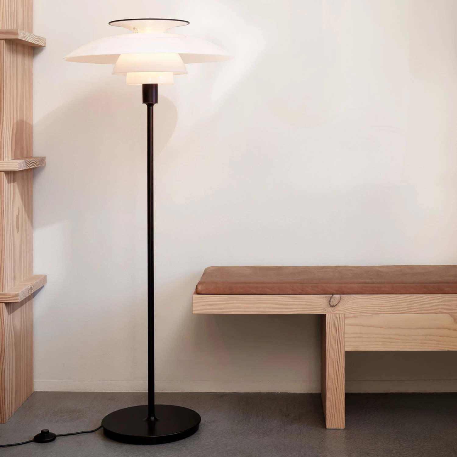 Die Stehleuchte PH 80 setzt sich aus einem pulverbeschichteten Ständer aus Stahl sowie einem dreilagigen Schirm zusammen, der aus opalweißem Acryl gefertigt wurde. Die Leuchte erzeugt ein angenehm diffuses und reflektiertes Licht, das größtenteils Richtung Boden abgestrahlt wird. Die dezente Farbgestaltung lässt PH 80 zeitlos wirken und stellt sicher, dass sie sich in unterschiedliche Einrichtungen und Wohnbereiche integrieren lässt. Per Fußschalter kann die Leuchte ein- und ausgeschaltet werden.