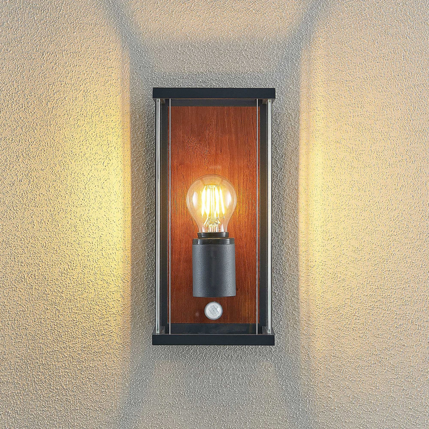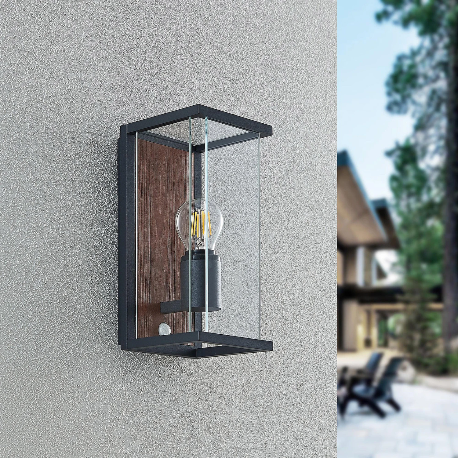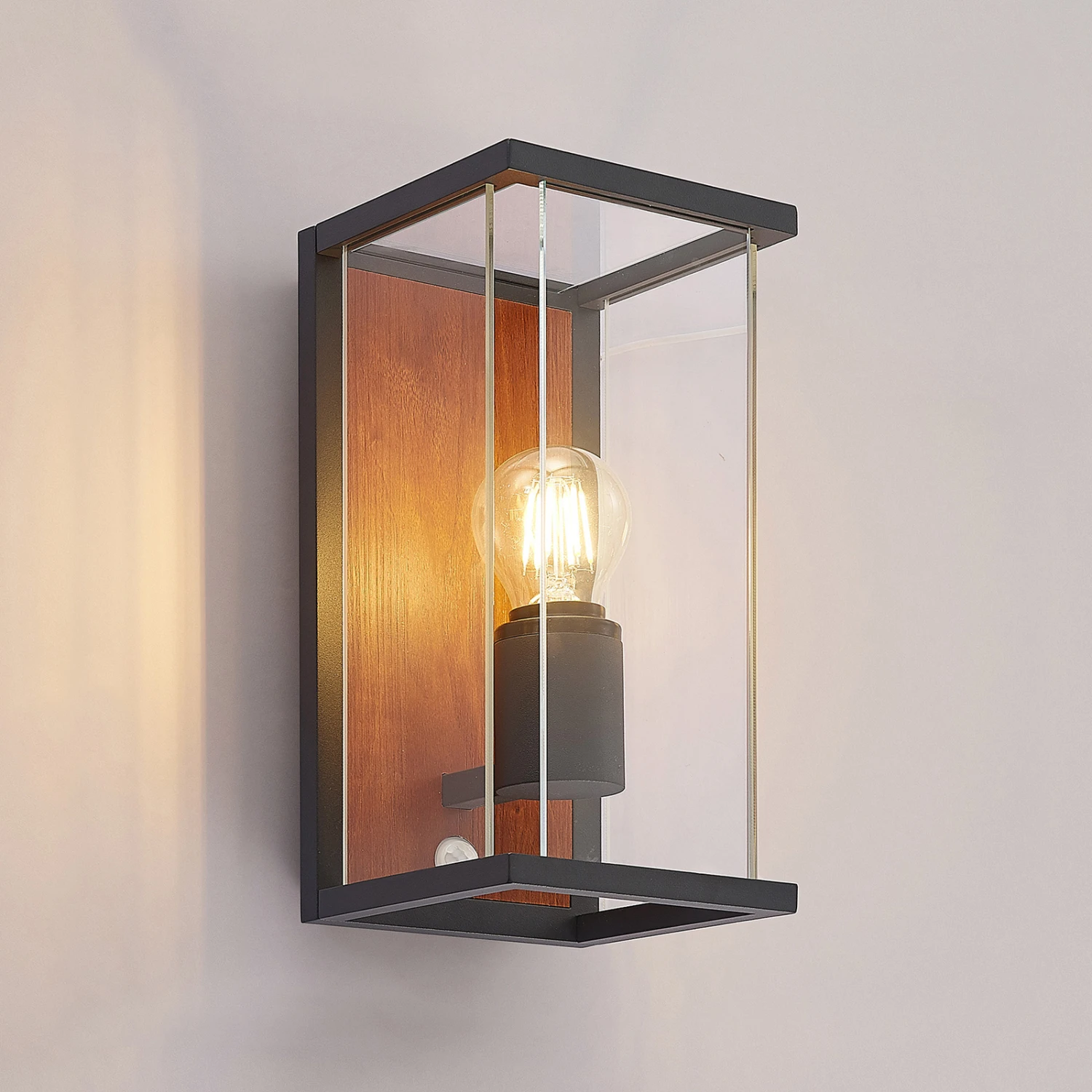 Sensor-Außenwandlampe Elwin mit Element in Holzdekor und seitlichen Glaseinsätzen