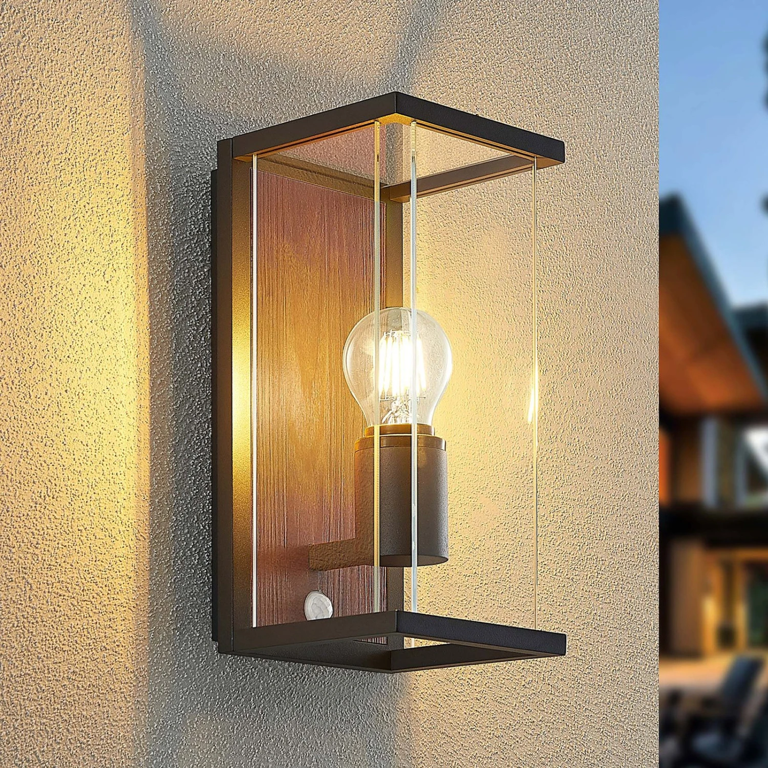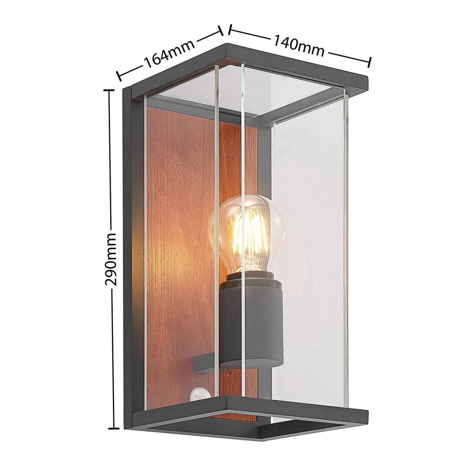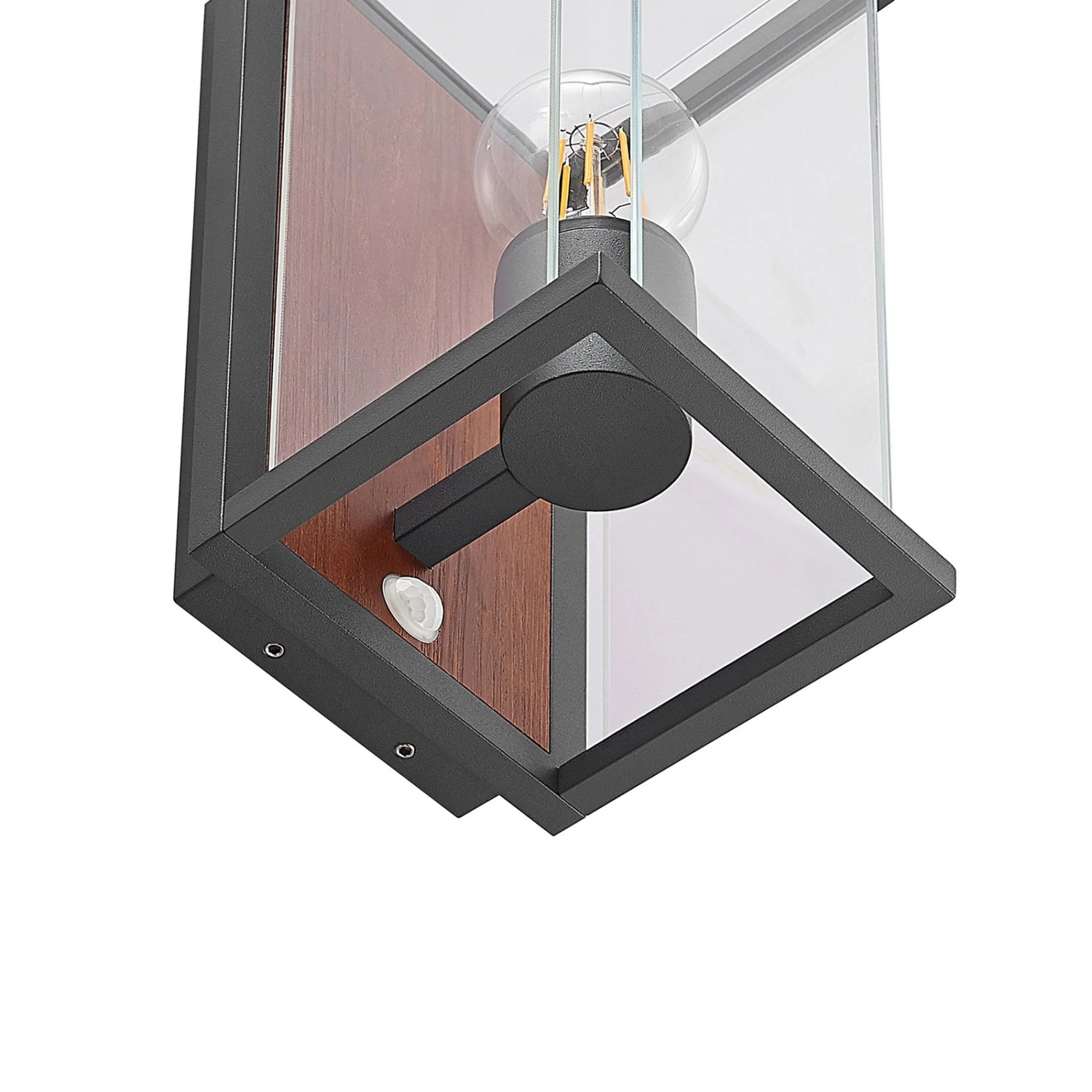 Sensor-Außenwandlampe Elwin mit Element in Holzdekor und seitlichen Glaseinsätzen