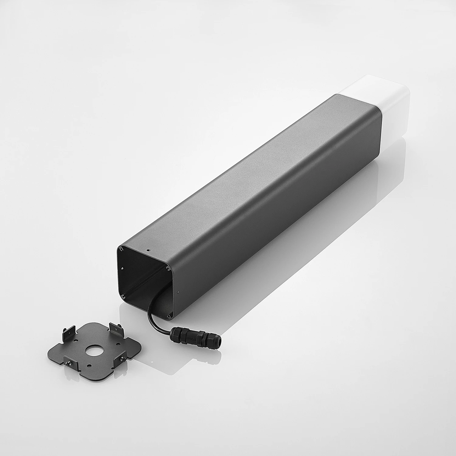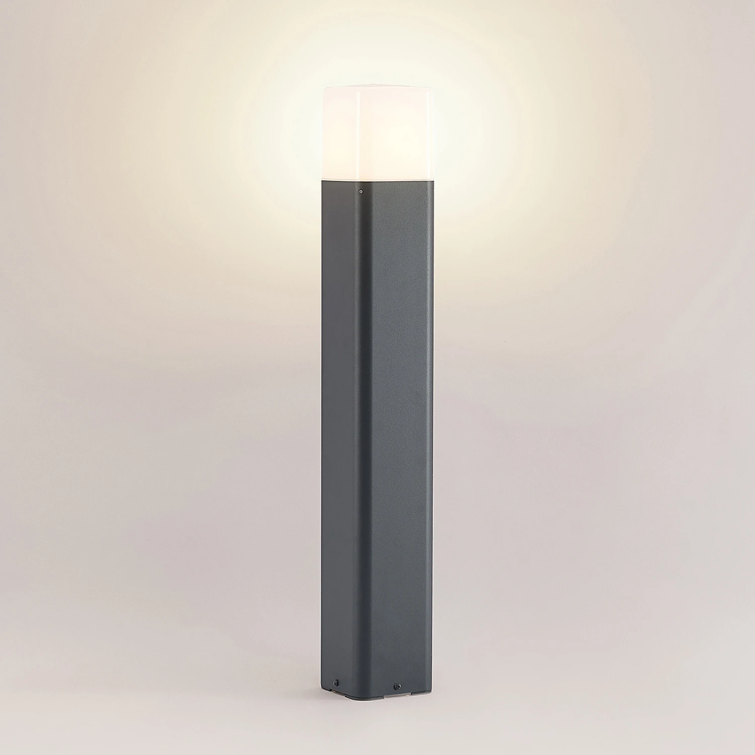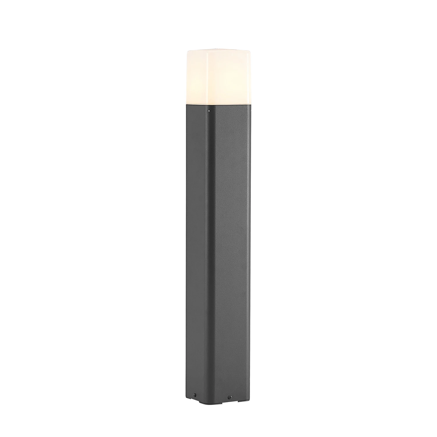 Vielseitig rund ums Haus einsetzbar, bietet die moderne Wegeleuchte Obuna ein gute, blendfreie Beleuchtung, die für Sicherheit und Orientierung im Dunkeln sorgt. Die Leuchte besteht aus einem Korpus aus dunkelgrauem Aluminium, der viereckig gesaltet und mit einem opalweißen Kunststoffschirm auf der Oberseite ergänzt wird. Dieser verbirgt und schützt das innenliegende Leuchtmittel, welches nicht im Lieferumfang enthalten und separat erhältlich ist. Das Licht kann dann durch den Schirm gleichmäßig in die Umgebung leuchten.