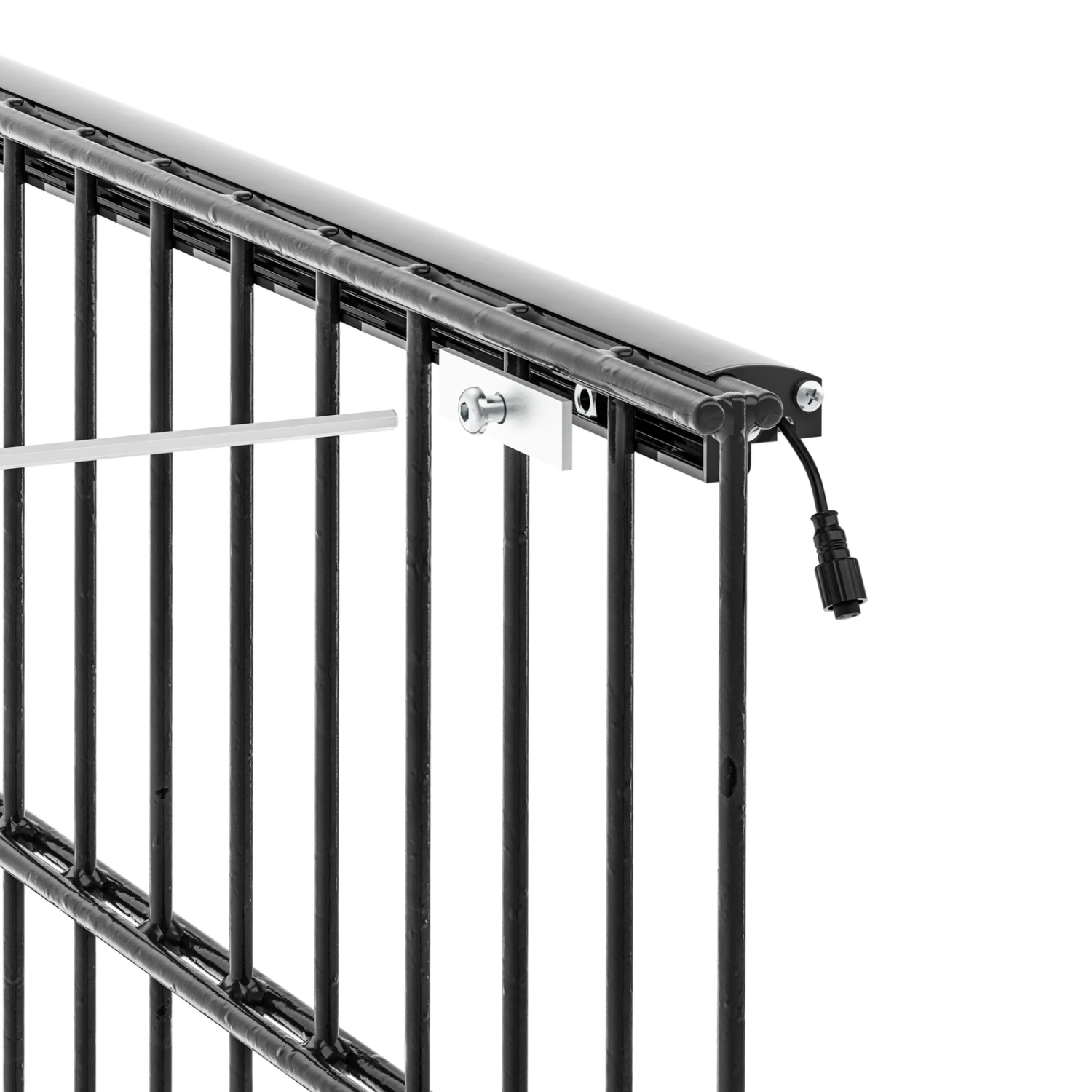 Das praktische Starter-Set von LyghtUp® besteht aus drei LED-Leuchtleisten, Verbindungskabeln und einem Netzteil (100 W). Das Starter-Set kann durch weitere einzelne Leuchten auf bis zu 12,5 m Länge erweitert werden. Die Leuchtleisten werden einfach auf den Zaun (Doppelstabmatten) aufgesteckt. Per Steckverbindung können mehrere Leuchtleisten miteinander verbunden werden. Schaltet man noch den als Zubehör erhältlichen WiFi-Dimmer (nicht inklusive) dazwischen, sind die Leuchtleisten auch per Zigbee dimm- und steuerbar.