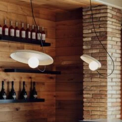 Bei der Premiumleuchten-Serie Wire werden herkömmliche Leuchtenbestandteile neu interpretiert und spielerisch zusammengesetzt. Statt das Stromkabel verstecken zu wollen, spielt es hier eine entscheidende Rolle, wie der englische Begriff Wire bereits vermuten lässt. Die Hängeleuchte hängt in zwei Teilen vom Baldachin ab. Ein flacher Schirm aus Stahl hängt von einem senkrechten Draht ab, ein kugelförmiger Diffusor aus opalweißem, mundgeblasenem Glas ist an einer etwas längeren Zuleitung befestigt. Die Zusammenführung ist dank integriertem Neodym-Magnet veränderbar. Die Kugel kann an einer beliebigen Stelle auf dem Schirm platziert werden und ist durch den Filzstoff vor Kratzern geschützt.