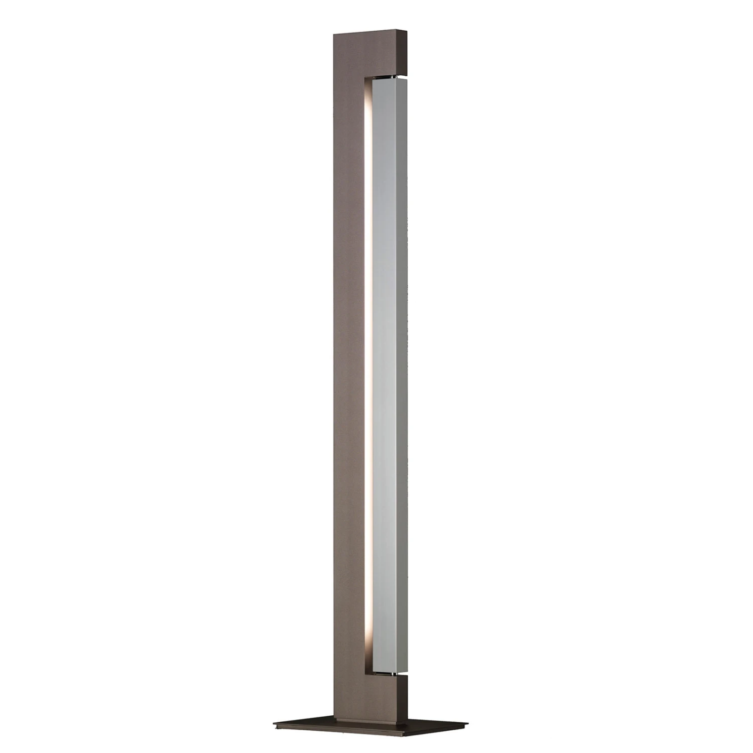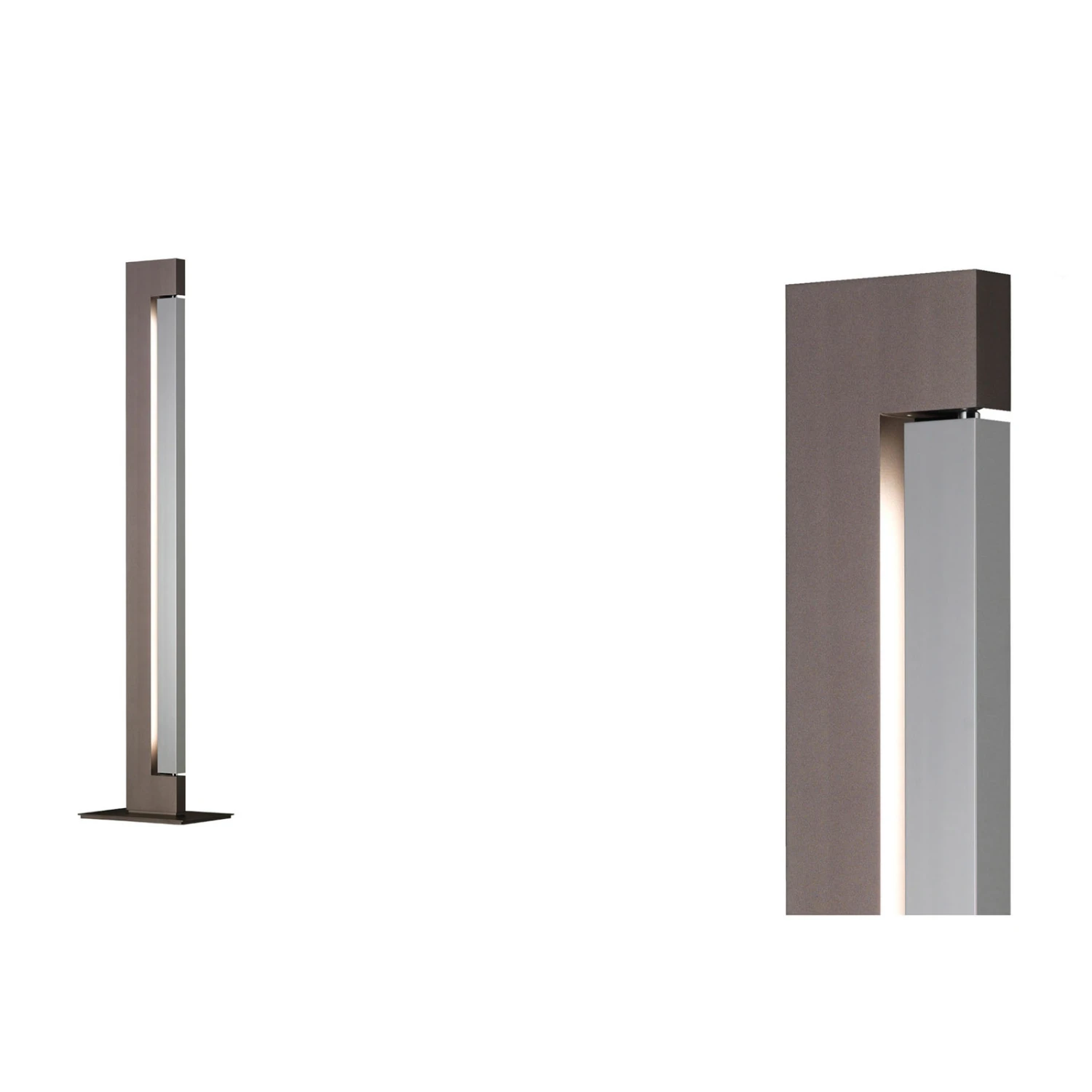 Durch und durch modern ist die Stehleuchte Ara konzipiert. Sie ist aus Aluminium-Druckguss gefertigt und in hoher, rechteckiger Form gestaltet. Der äußere Rahmen hält ein drehbares, inneres Element. Dieses ist zu einer Seite auf ganzer Höhe mit einem LED-Streifen ausgestattet, der je nach Bedarf ausgerichtet werden kann, um eine direkte oder indirekte Beleuchtung zu erzielen. Auf der Oberseite des äußeren Rahmens sind weitere LEDs integriert, sodass Ara zudem wie ein Deckenfluter verwendet werden kann. Beide LED-Bereiche können über Bedienflächen an der Leuchte unabhängig voneinander geschaltet und gedimmt werden. Letzteres bewirkt bei reduziertem Lichtoutput eine zunehmend warme Lichtfarbe (dim-to-warm von 3.000 K bis 2.500 K).