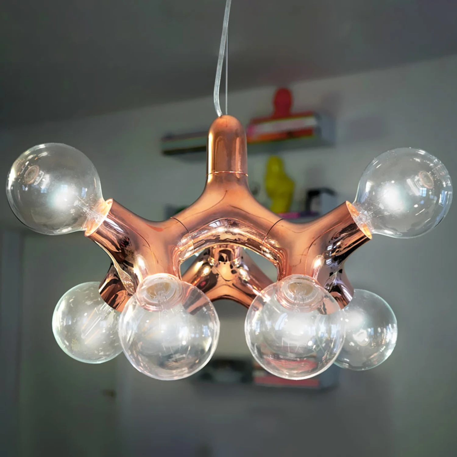 Fernab dessen, was man bei der Optik eines Kronleuchters erwartet, präsentiert sich das Kronleuchter-Modell aus der Leuchtenserie DNA als untypisches Beispiel für seine Kategorie. Statt gerader, nach oben gerichteter Leuchtkerzen mit Schirmchen ist DNA Chandelier mit insgesamt neun Lichtstellen in Form von Globe-Leuchtmitteln (exklusive) ausgestattet, die alle in verschiedene Richtungen zeigen. Dies ist dem Design geschuldet, das sich Hopf & Wortmann, die Designer von DNA, für ihre Kreation ausgedacht haben.