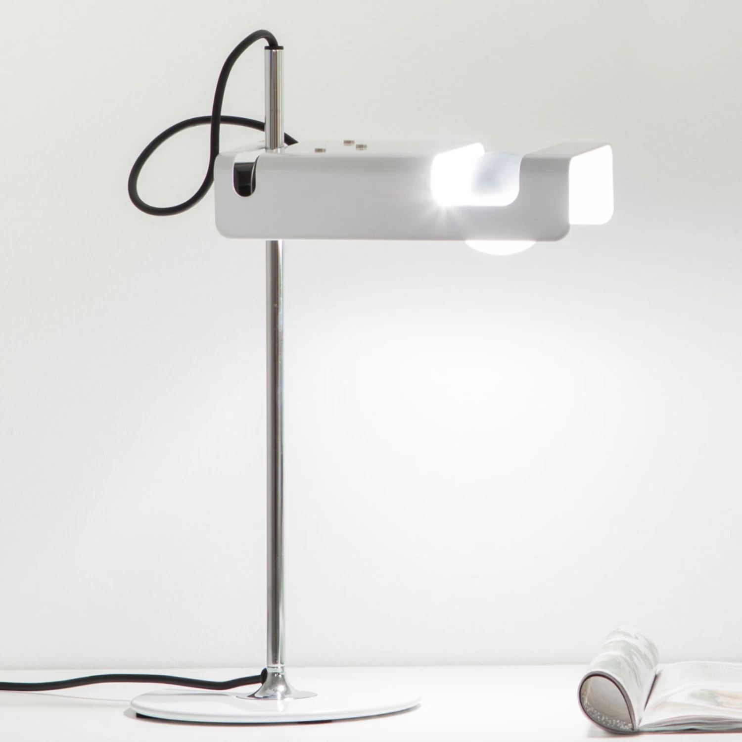 Die Tischleuchte Spider wurde bereits im Jahr 1965 vom Designer Joe Colombo zu dem Zweck entworfen, eine horizontal strahlende Lichtquelle zu sein. Über ein Kunststoffgelenk ist der Aluminiumreflektor in der Höhe verstellbar, so dass der Strahlungswinkel des Leuchtmittel variiert werden kann. Einen ansprechenden Kontrast dazu bildet der schlanke Fuß aus chromglänzenden Metall.