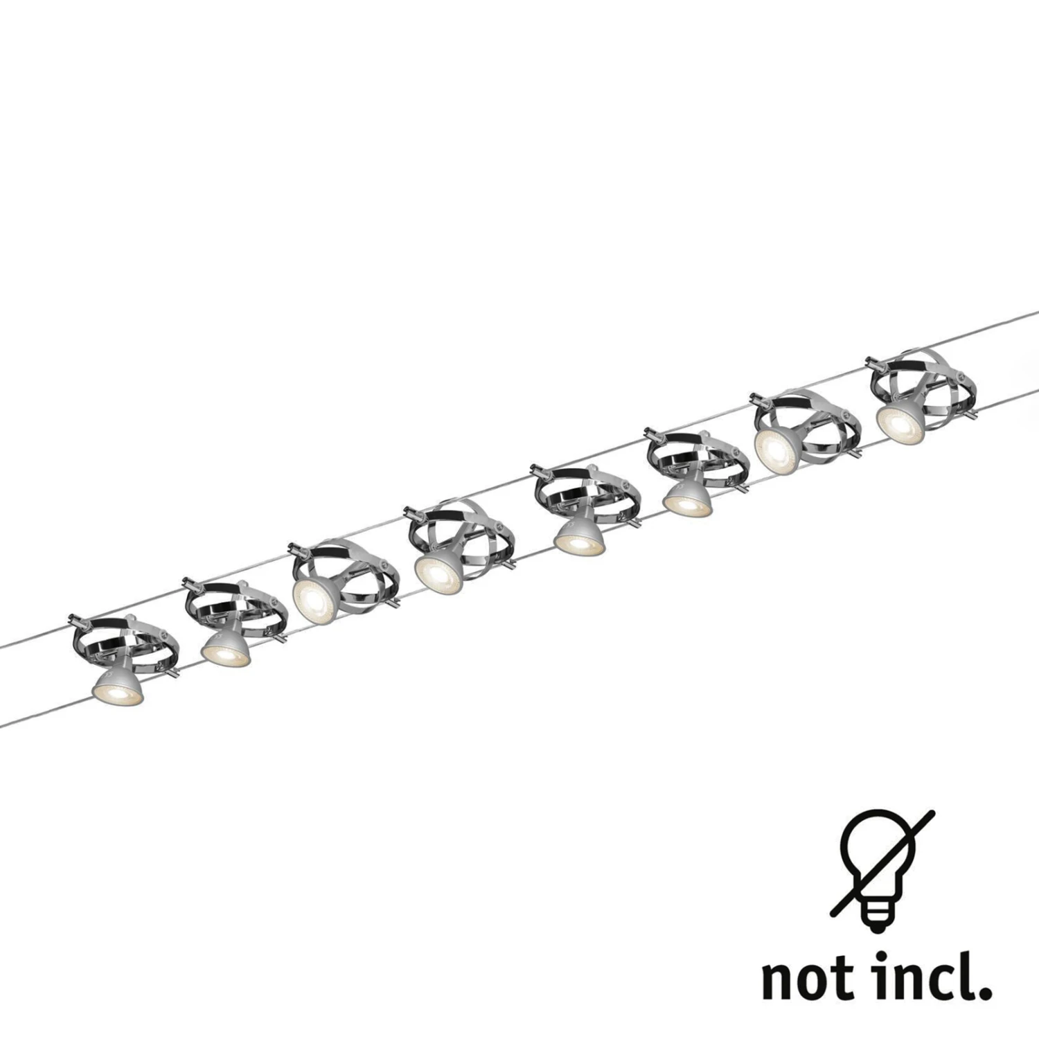 Auch große Räume lassen sich mit dem achtflammigen Seilsystem Cardan beleuchten. Die Leuchten des Seilsystems bestehen aus zwei schmalen Metallringen, die eine GU5,3-Fassung umgeben, wobei sich die Ringe schwenken lassen, so dass das System optisch verändert werden kann. Das Seilsystem wird anschlussfertig inklusive Montagematerial geliefert und kann nicht nur an der Zimmerdecke, sondern auch an einer Wand montiert werden. Leuchtmittel sind nicht im Lieferumfang enthalten.