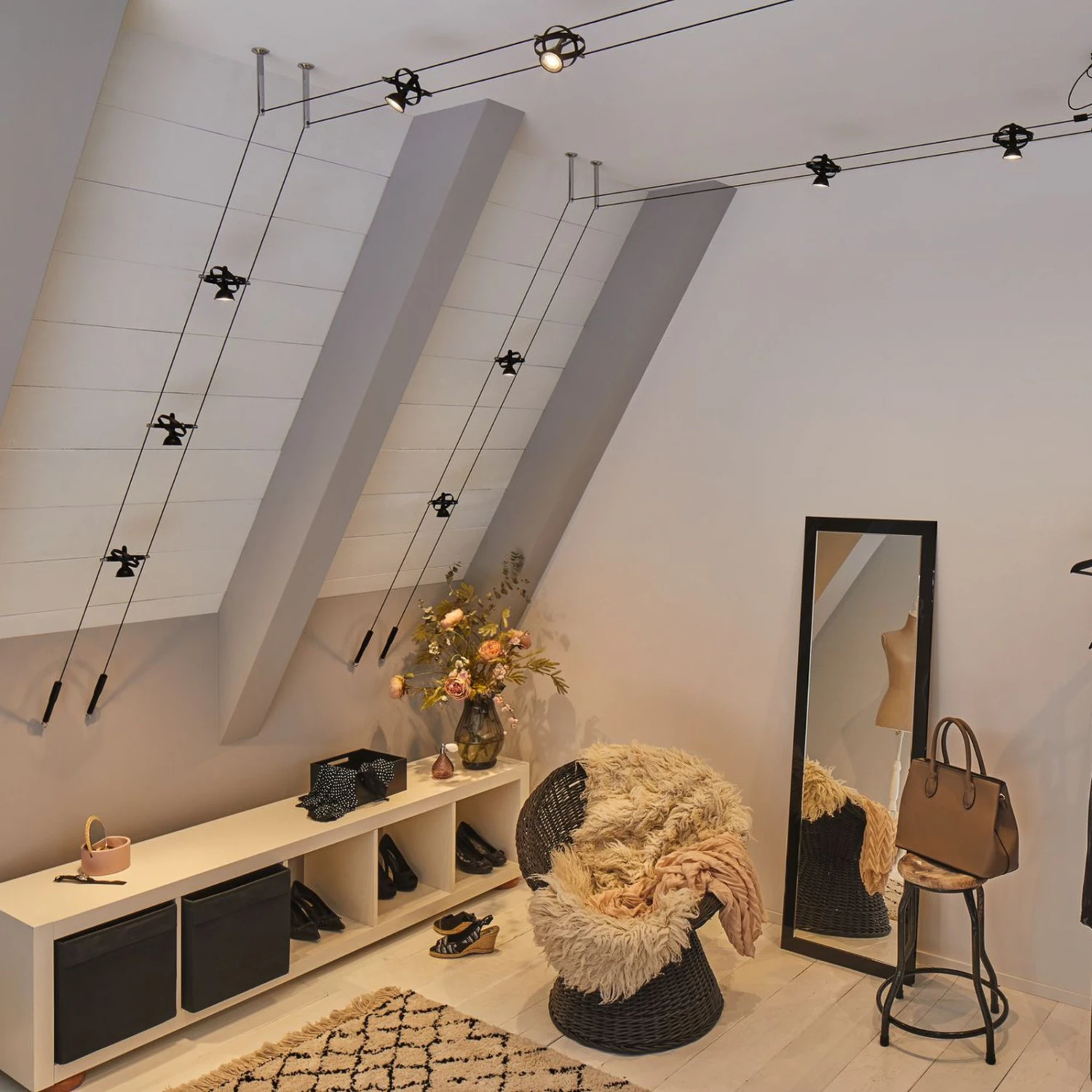 Grenzenlose Gestaltungsmöglichkeiten und eine Montagemöglichkeit an der Decke, einer Dachschräge oder an der Wand bietet das Seilsystem Cardan, das als Komplettset geliefert wird. Die acht Leuchten sind jeweils mit einer GU5,3-Fassung ausgestattet, die von zwei unterschiedlich großen, drehbaren Ringen umgeben wird. Die acht Leuchten können nicht nur am Seil beliebig positioniert werden, sie sind auch dreh- und schwenkbar, so dass sich die einzelnen Leuchten in unterschiedliche Raumbereiche ausrichten lassen und mit dem Seilsystem auch verwinkelte Räume oder lange Flure perfekt ausgeleuchtet werden können. Leuchtmittel werden nicht mitgeliefert.