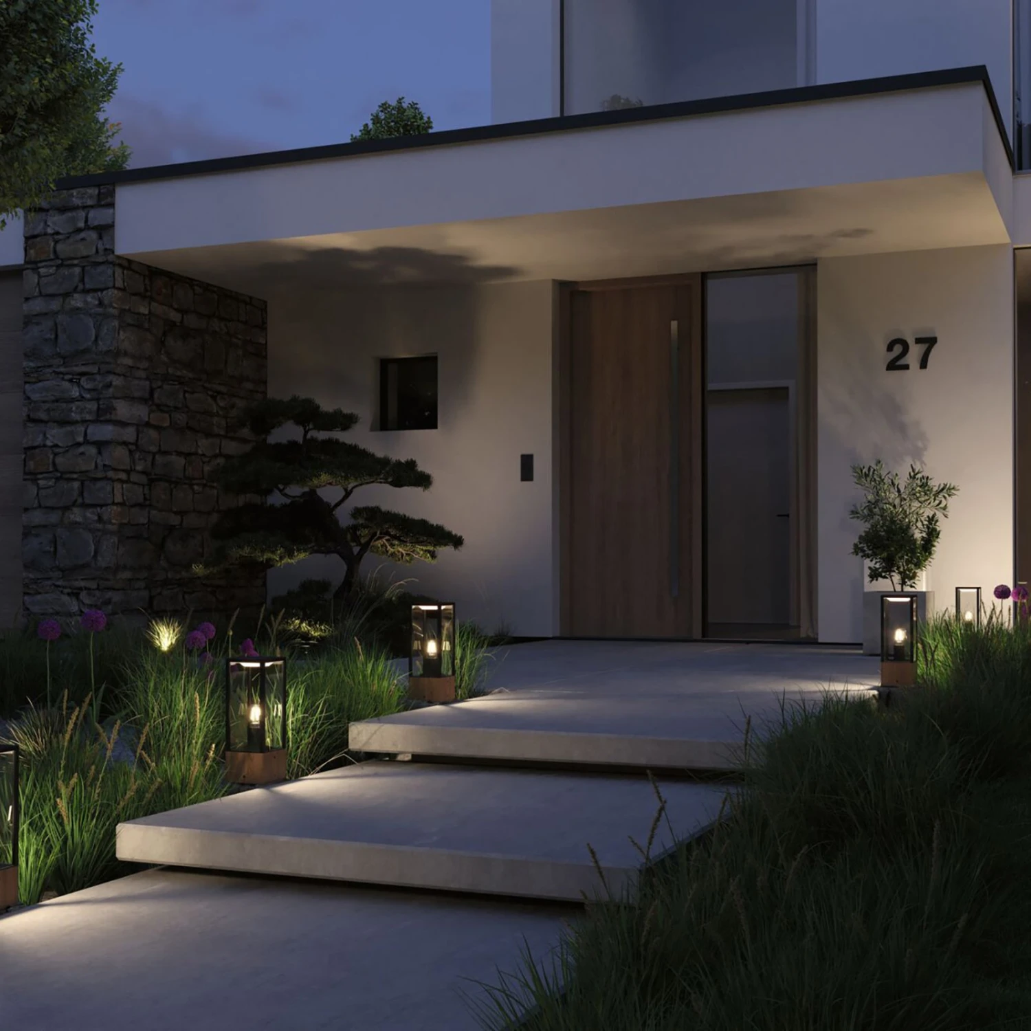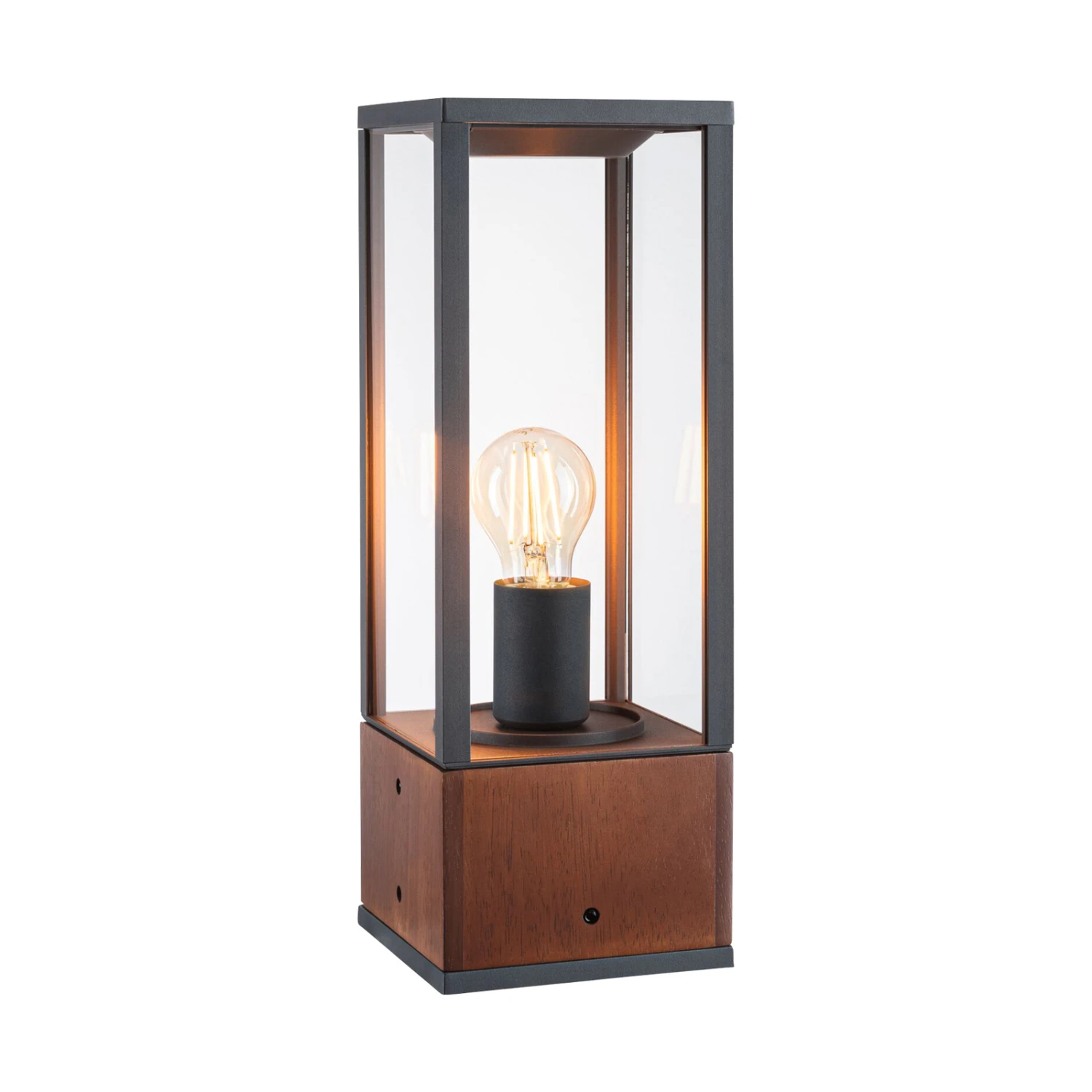 In der Form einer geradlinigen, modernen Laterne präsentiert sich die Sockelleuchte Timba. Ihren besonderen Charme verdankt sie der Kombination aus Holz und schwarz gestaltetem Metall, das als offener Quader aus Streben eine kantige Laterne bildet. In der Laterne wurde eine E27-Fassung verbaut, die mit einem Leuchtmittel nach Wahl bestückt werden kann. Das Licht wird zu allen Seiten abgestrahlt, so dass die Sockelleuchte Terrassen oder Wege sicher beleuchtet, gleichzeitig stellt sie durch ihre stilvolle Gestaltung eine schöne Dekoration dar, auch ausgeschaltet.