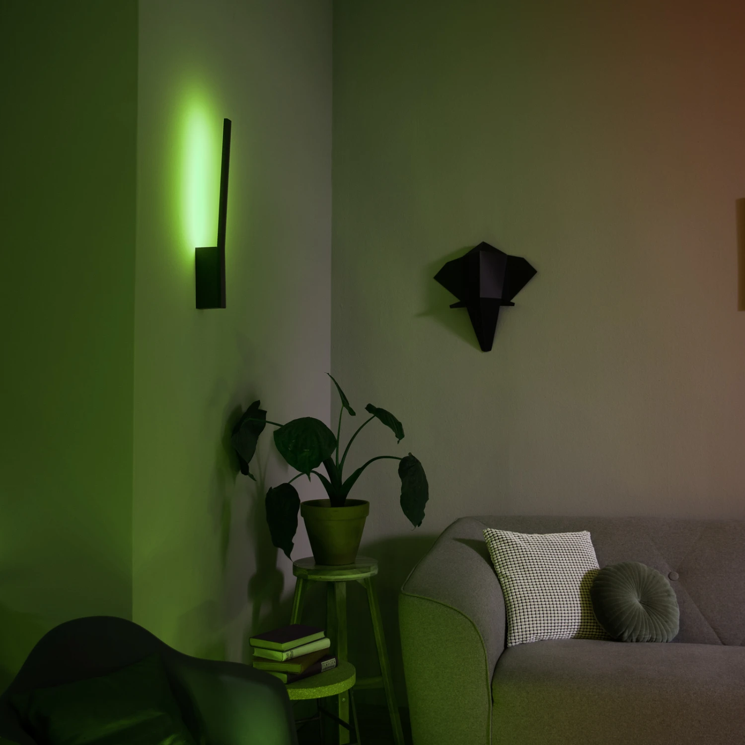 Smarte Bedienung, schlichte Formgebung, vielfältige Lichtoptionen – Liane ist eine durch und durch moderne Wandleuchte. Der hohe, rechteckige Stab ist rückseitig mit einem White and Color Ambiance-LED-Strip ausgestattet. Dieser sorgt für einen Akzent an der Wand und indirekte Beleuchtung – wahlweise in warmweißem bis tageslichtweichem oder buntem Licht.